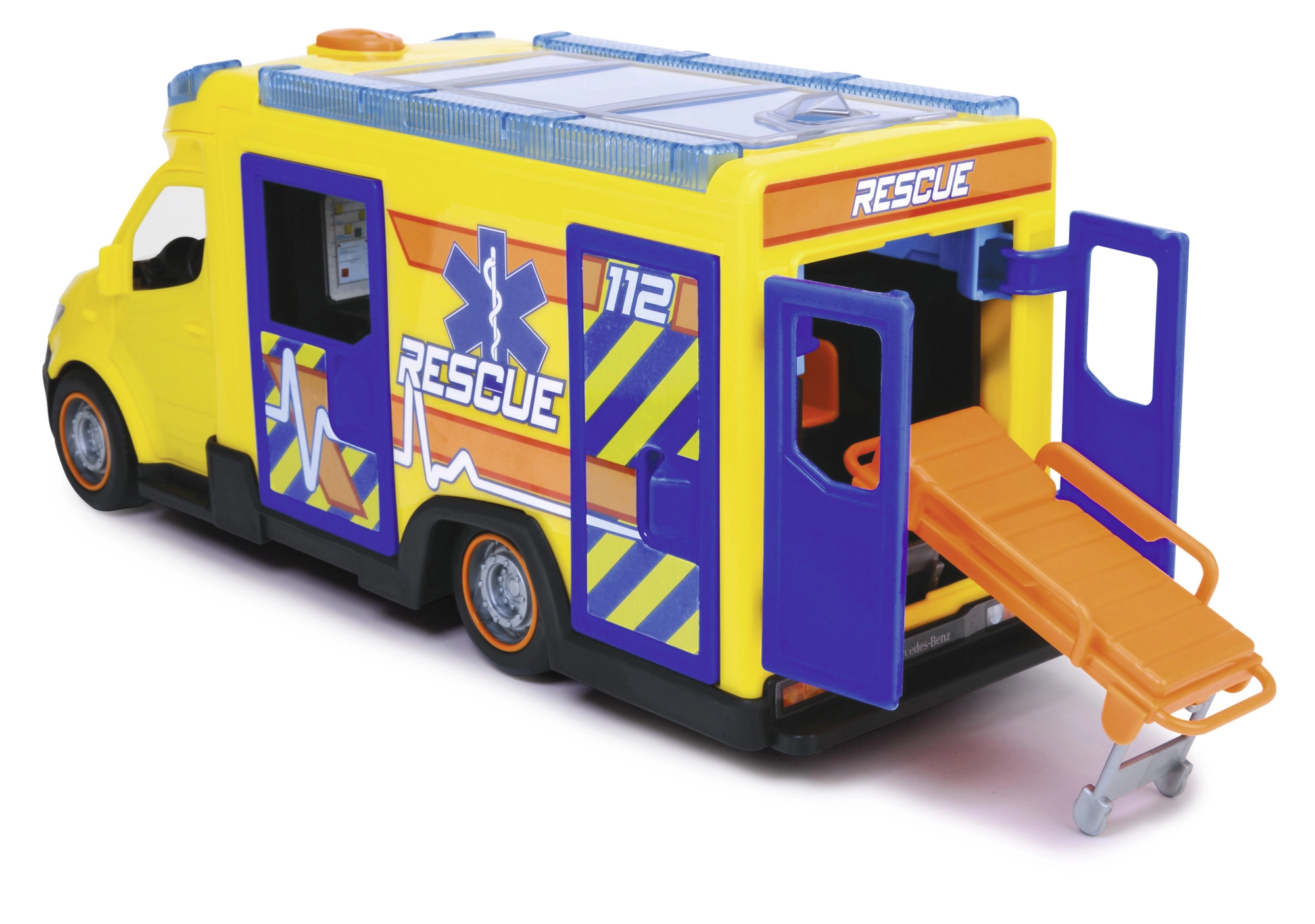 Oficiāli licencētais Mercedes-Benz neatliekamās palīdzības auto piedāvā plašas spēļu iespējas ar 34,5 cm garumu.