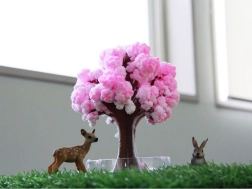 Burvju ziedošais kociņš jūsu mājās dažu stundu laikā ienesīs pavasarīgu noskaņu. Papīra koka siluets pēc aplaistīšanas uzsūc šķīdumu, un uz zariem veidojas smalki, gaisīgi kristāli rozā toņos – kā ziedoša sakura. Pateicoties caurspīdīgajam trauciņam, kociņš izceļas uz rakstāmgalda, plaukta vai naktsskapīša.