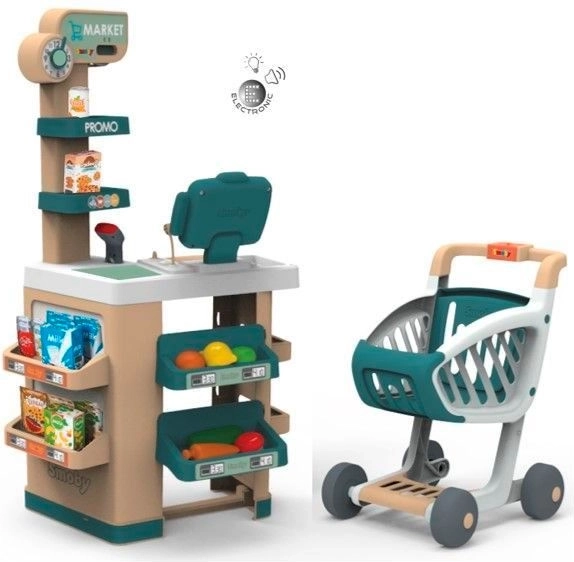 Sniedziet savam bērnam stundām ilgu izklaidi ar šo reālistisko bērnu supermārketu. Šis komplekts ir aprīkots ar elektronisko kases aparātu, kas piedāvā skaņas un gaismas efektus, pastiprinot iepirkšanās autentiskumu. Ar integrēto aprēķinu funkciju bērni var spēlēties par kasieri.