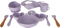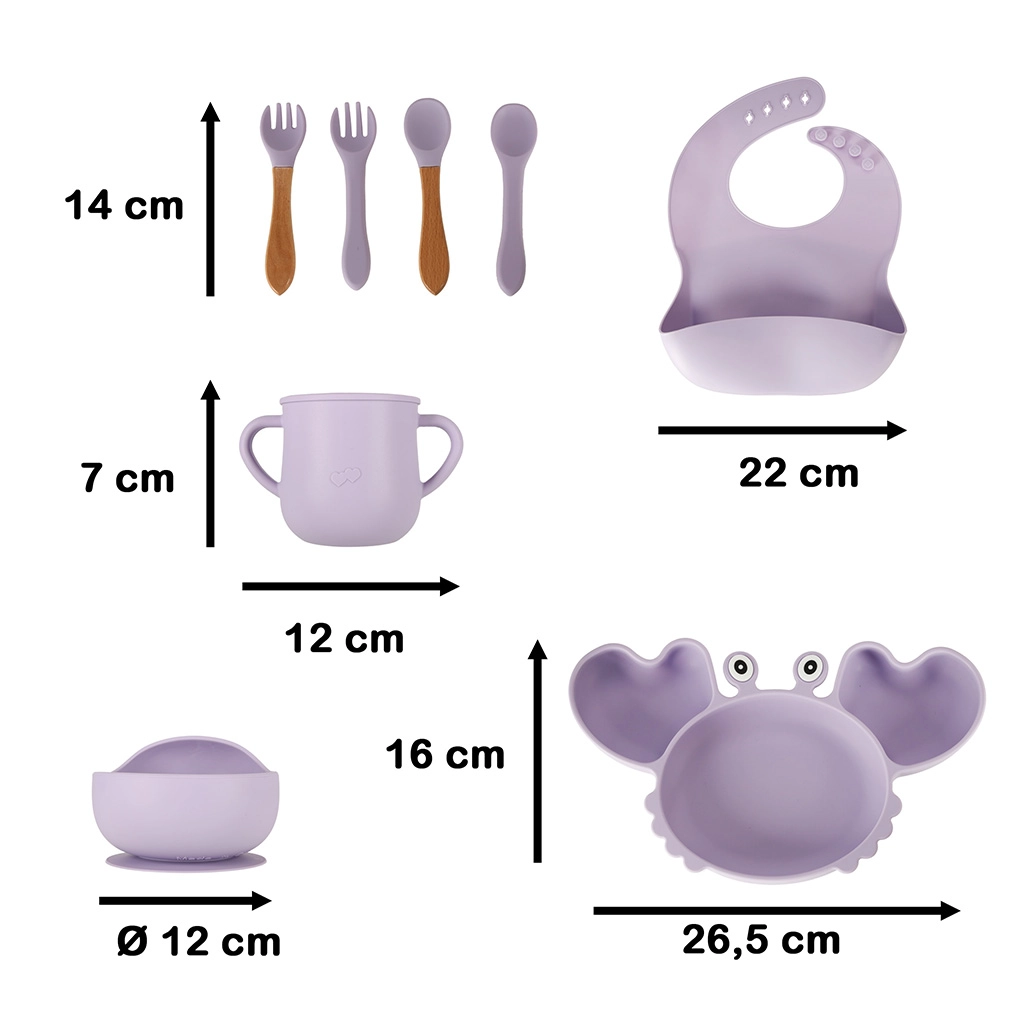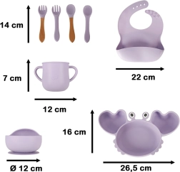 Pilns 9 daļu silikona komplekts pirmajai patstāvīgajai ēšanai. Ietver krabja šķīvi, bļodu ar piesūcekni, treniņkrūzi ar diviem vāciņiem un salmiņu, galda piederumus un praktisku priekšautiņu. Viss no droša, BPA nesaturoša silikona, ar pretizslīdes piesūcekņiem un vienkāršu kopšanu tīrai un ērtai mazā ēdāja maltītei.