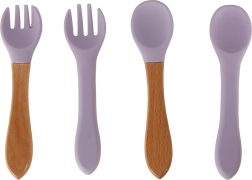 - Patīkami materiāli: mīksts silikons + koka rokturi galda piederumiem