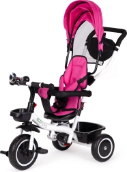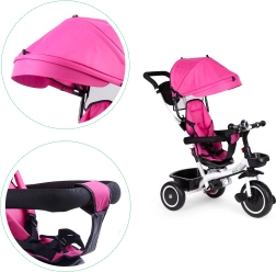 ECO TOYS trīsritenis ir izstrādāts maksimālam bērnu komfortam un drošībai. Tas aprīkots ar mīkstu atzveltni, 5 punktu drošības jostām un noņemamām drošības barjerām, kas novērš izkrišanu. Salokāms jumtiņš pasargā no saules un lietus, savukārt rotējošs rāmis un sēdeklītis atvieglo bērna ielikšanu. Pateicoties izturīgam tērauda karkasam, trīsritenis ir drošs un uzticams.
