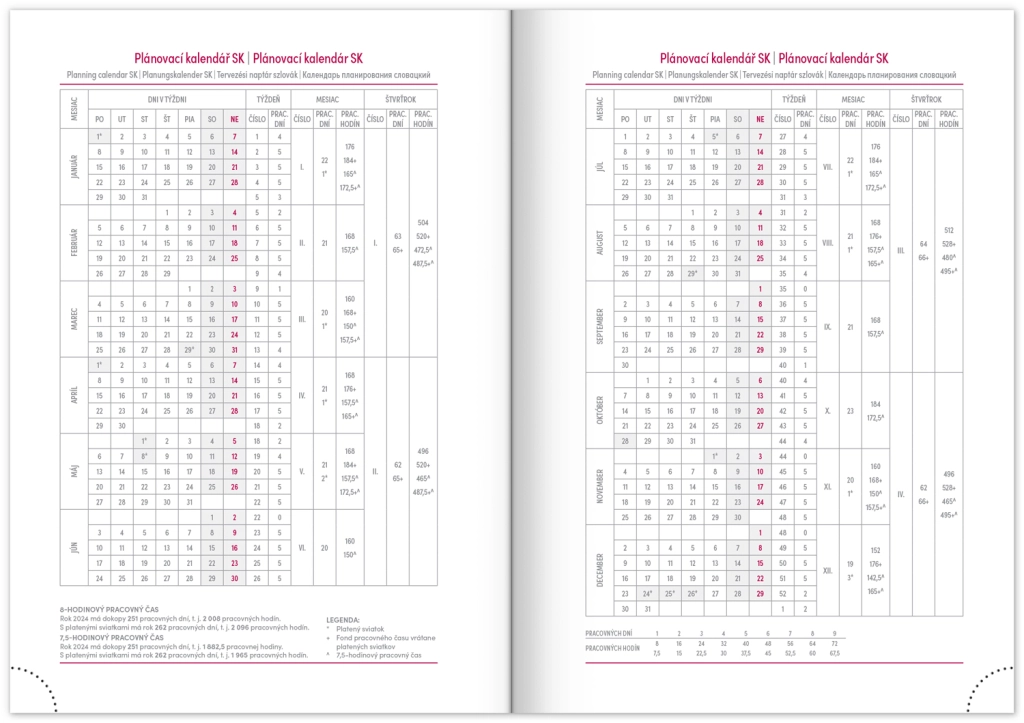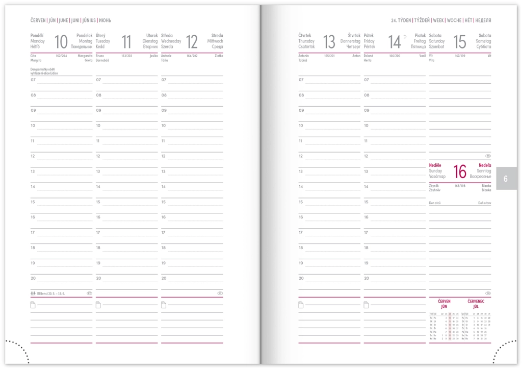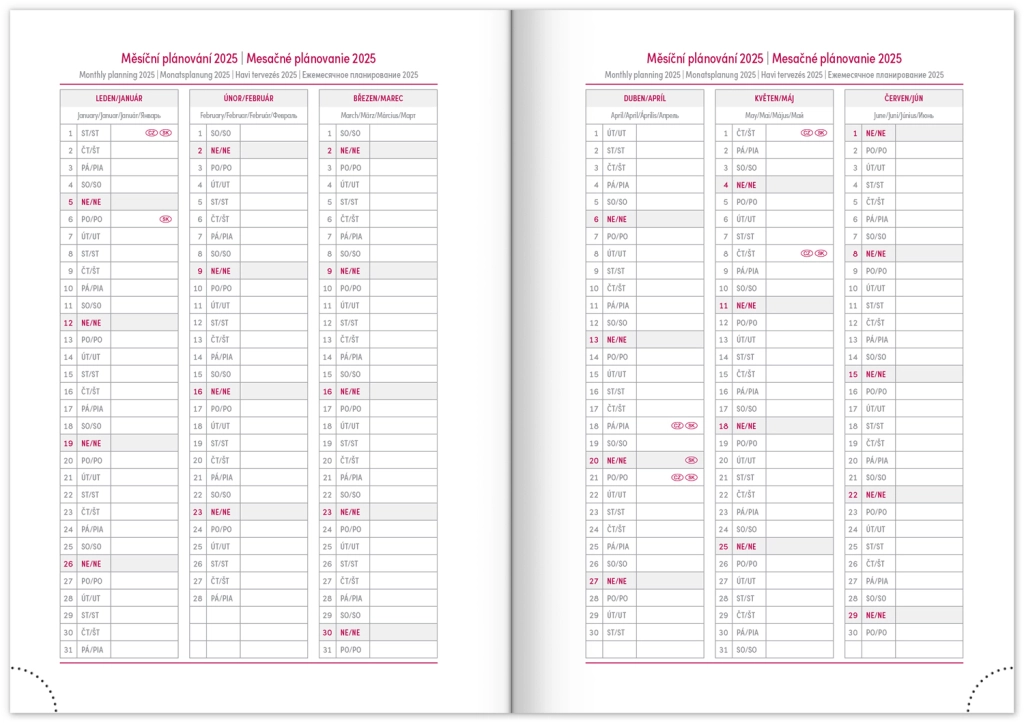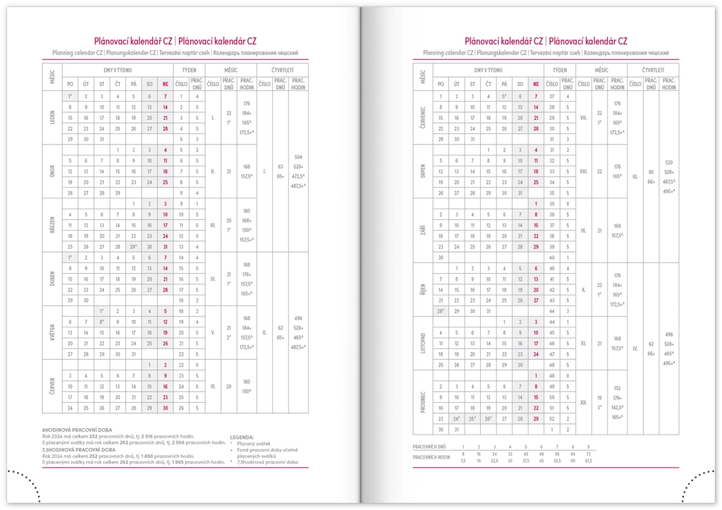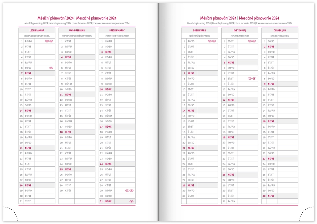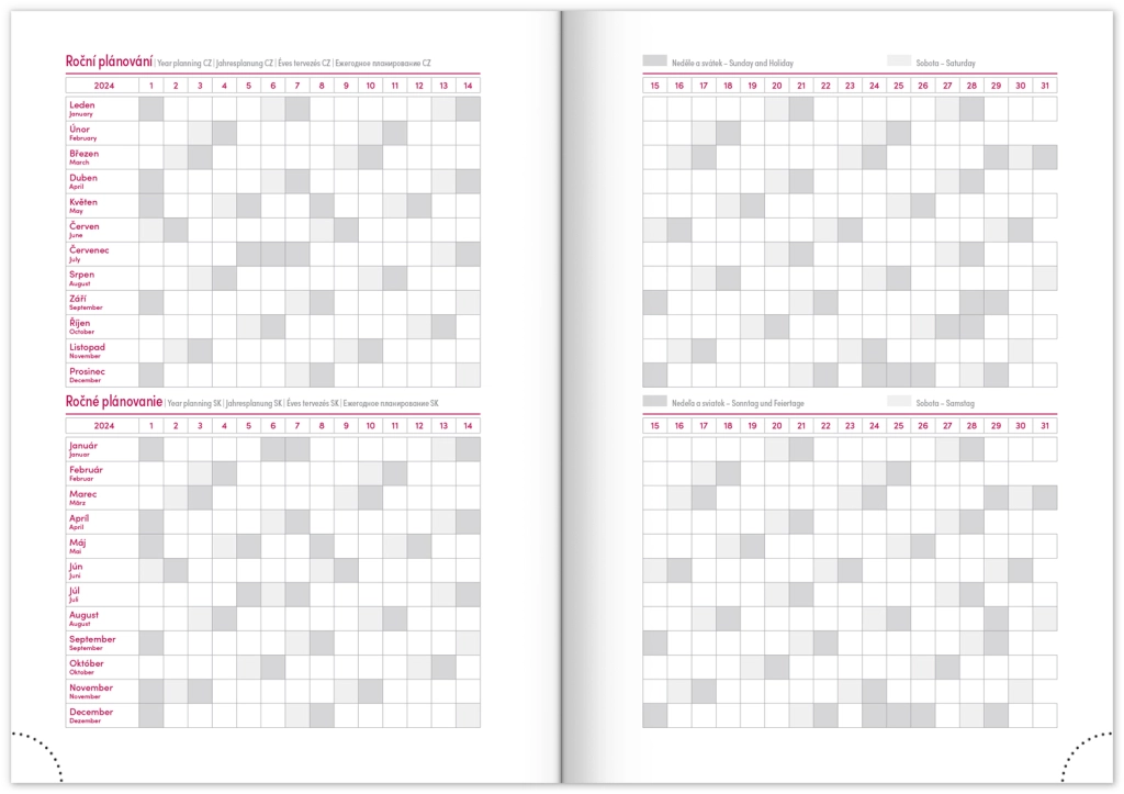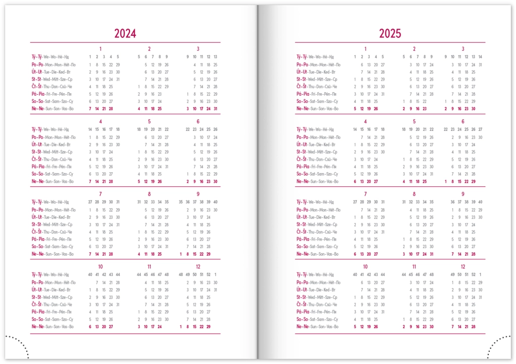 Nedēļas plānotājs Capys 2024 elegantā sarkanā krāsā ar strukturētu auduma virsmu, ideāli piemērots folijas iespiešanai. Satur nedēļas pārskatu ar čehu-slovāku kalendāru, papildinātu ar angļu, vācu, ungāru un krievu valodu.