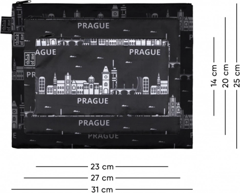 Katrai somiņai ir praktiska augšējā aizdare ar rāvējslēdzēju un kontrastains prints ar PRAHAS panorāmu. Pateicoties melnajai krāsai un mūžīgam dizainam, tās viegli saskaņot ar jebkuru bagāžu. Komplekts ir lieliska izvēle arī kā stilīgs suvenīrs vai dāvana pilsētas cienītājiem.