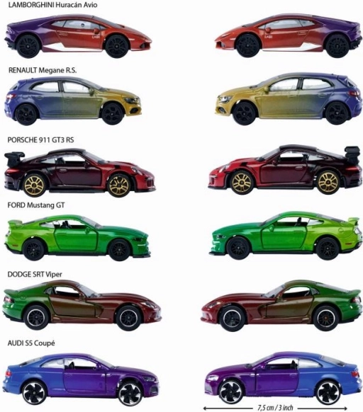 Izvēlieties no PORSCHE 911 GT3 RS, LAMBORGHINI HURACÁN, AUDI S5 COUPÉ, FORD MUSTANG GT, DODGE SRT VIPER un RENAULT MEGANE R.S. modeļiem – katrs pievilcīgos toņos ar Color Changers efektu.