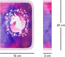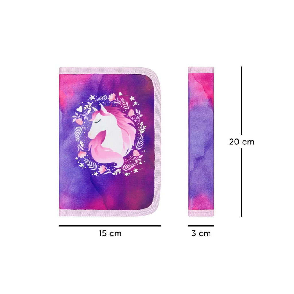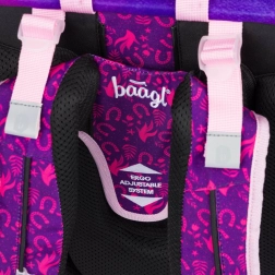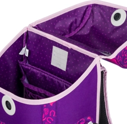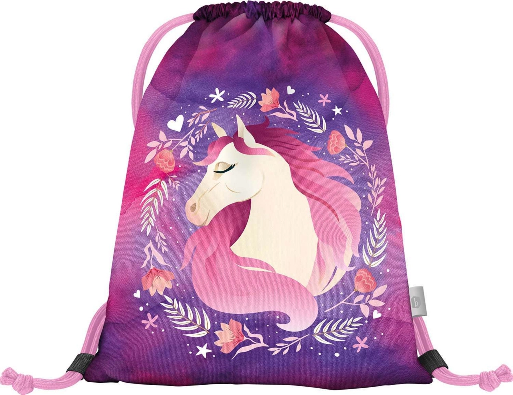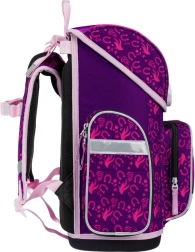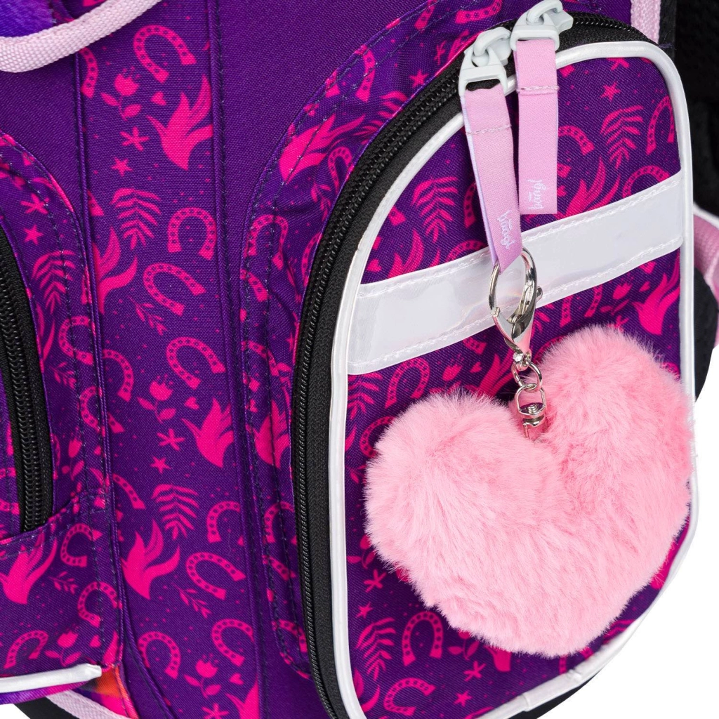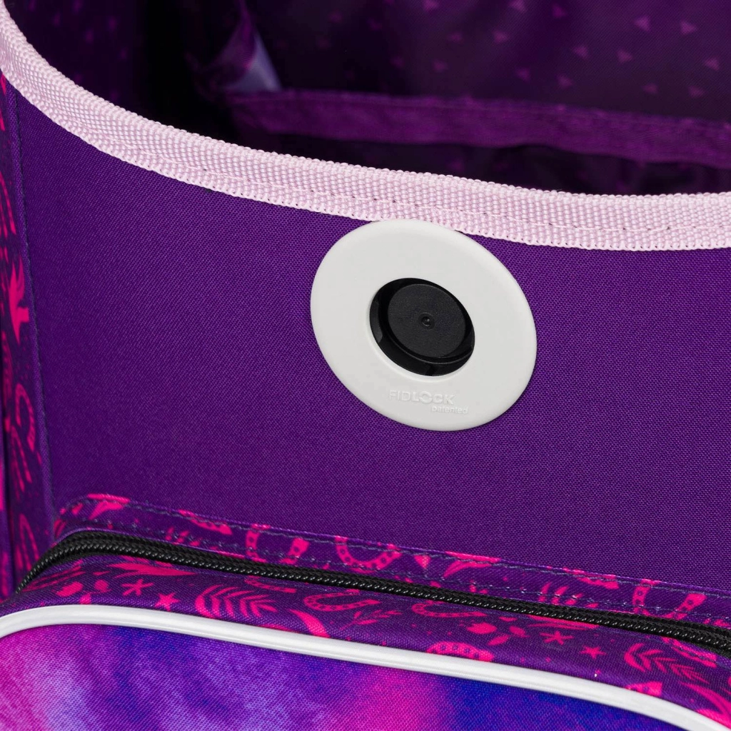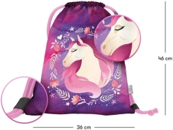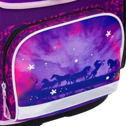 Stilīgs skolas komplekts ar zirga motīvu mazajiem skolēniem no 1. klases: ergonomiska aktovka, ietilpīgs penālis un praktisks apavu maiss. Aktovkai ir ergonomiski veidota mugura un pārbīdāma ERGO ADJUSTABLE SYSTEM sistēma ideālai pielāgošanai, magnētiskais Fidlock aizdaris ērtai atvēršanai, atstarojošie elementi drošībai un zems svars zem 1 200 g. Komplektu raksturo kvalitatīvs izpildījums, ūdensizturīgi materiāli un skaists violeti-rozā dizains ar zirgu motīviem.