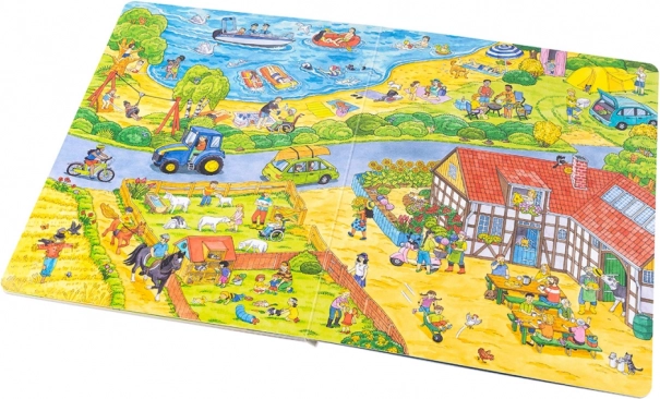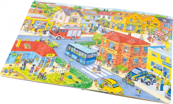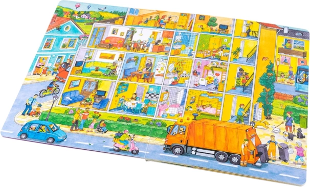 Šī lielā formāta grāmata ir ideāli piemērota kopīgai lasīšanai un stāstīšanai. Bērni iepazīs, kas pilsētā notiek no rīta līdz vakaram – no atkritumu izvedējiem un iepirkšanās, līdz bērnudārzam, būvlaukumam, ugunsdzēsējiem un policijai, kā arī pēcpusdienas izpriecām parkā un izbraucieniem pie ezera vai uz saimniecību. Katra lappuse ir pilna ar sarunu ierosinājumiem un detaļu meklēšanu.