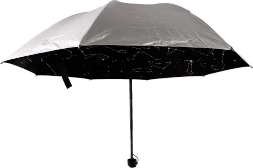 Atklājiet praktisku un elegantu aksesuāru lietainām dienām. Šis saliekamais lietussargs izceļas ar sudrabotu virsmu un iekšpusi kā zvaigžņota debess ar zvaigznājiem, kas jūsu gaitām piešķir personisku stilu. Vieglā konstrukcija un ērta siksniņa atvieglo pārnēsāšanu un uzglabāšanu.