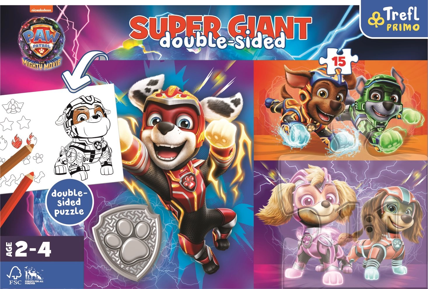 Šī puzles pamatne satur divpusēju ilustrāciju. Aizmugurē atradīsiet divas nodarbes – krāsojamo lapu un vienkāršu spēli ar krāsošanas elementiem. Puzzle Super Giant 15 ne tikai sniedz prieku spēlējoties, bet arī veicina sīkās motorikas, uzmanības un radošuma attīstību jau agrīnā vecumā.