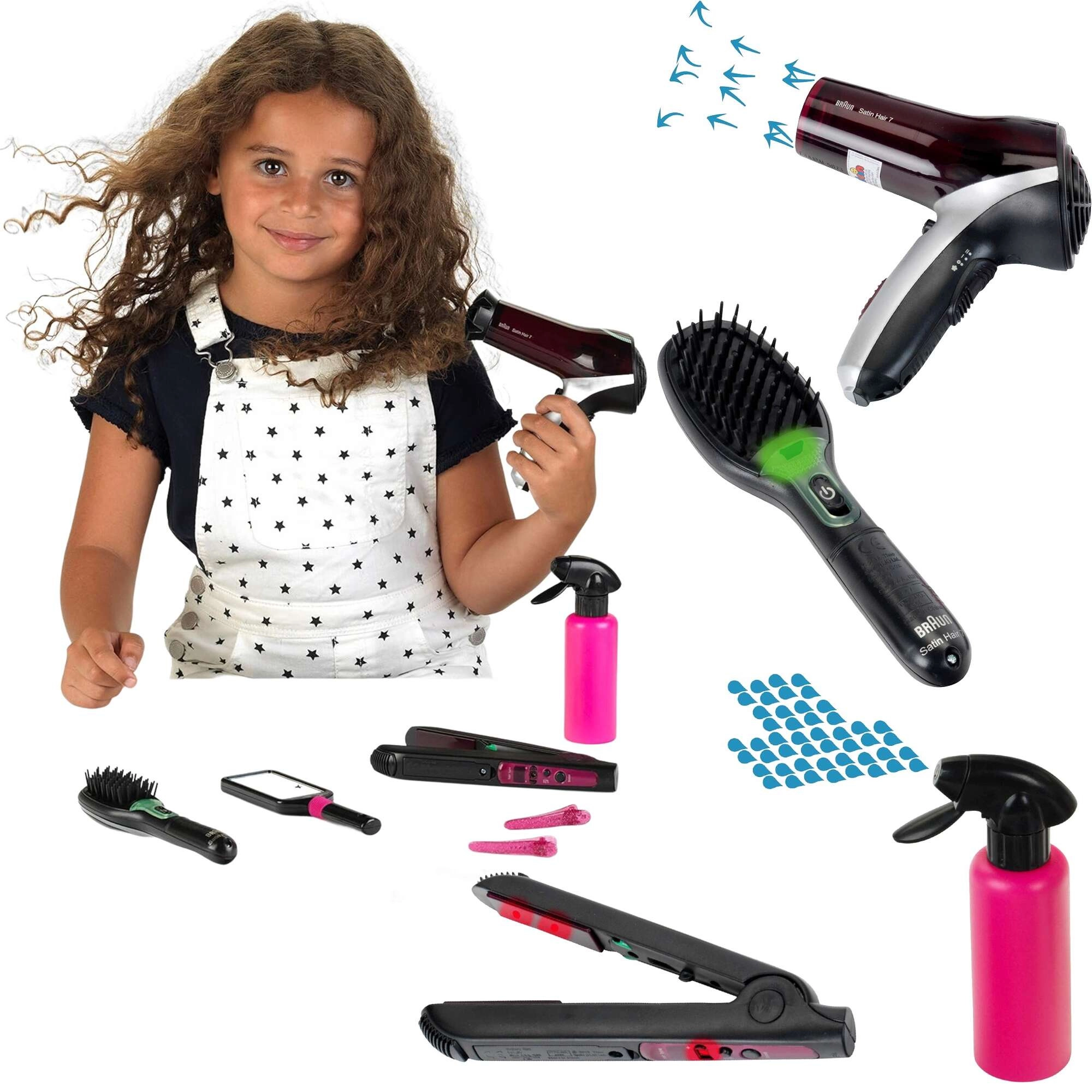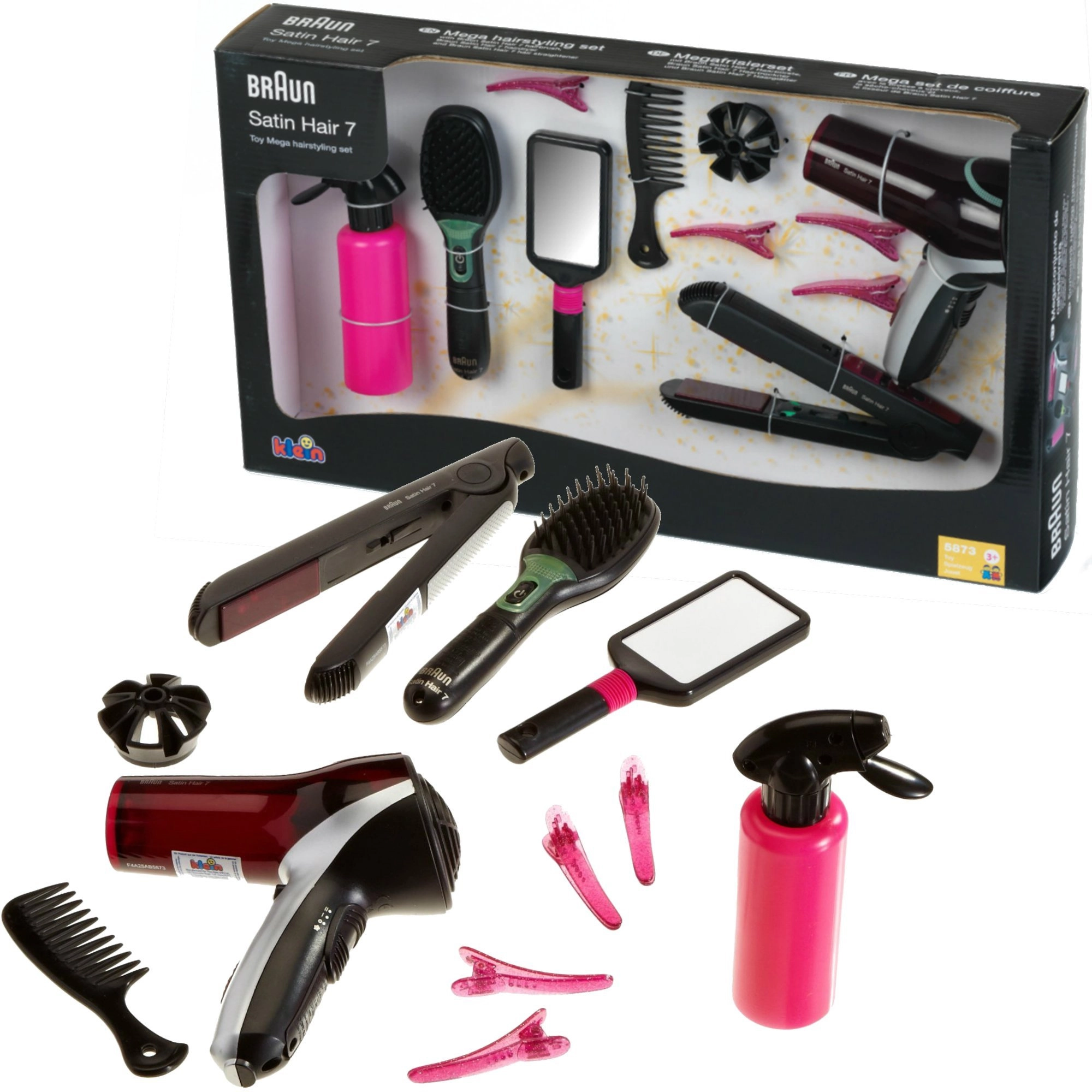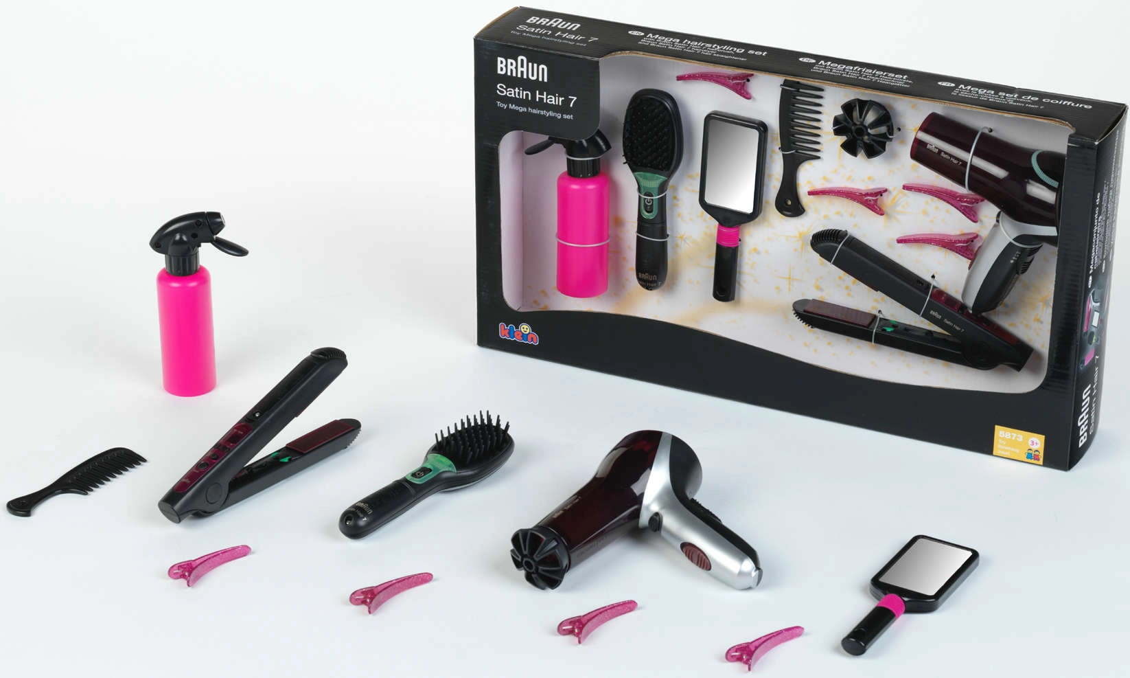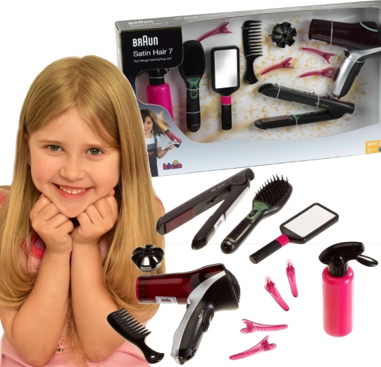 Lielais frizieru komplekts, iedvesmots no BRAUN Satin Hair līnijas, piedāvā bērniem visu, kas vajadzīgs stilīgām frizūrām. Rotaļlietas veidotas ar uzsvaru uz drošību un atdarina īstus rīkus – fēns, taisnotājs un birste darbojas ar baterijām un rada realistiskus gaismas un skaņas efektus, vienlaikus neizdalot karstumu un gaisa plūsmu.