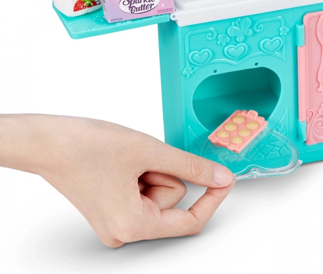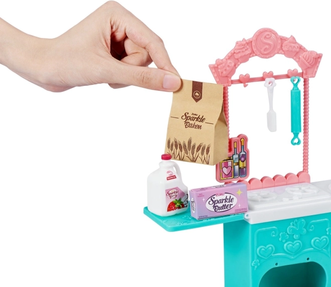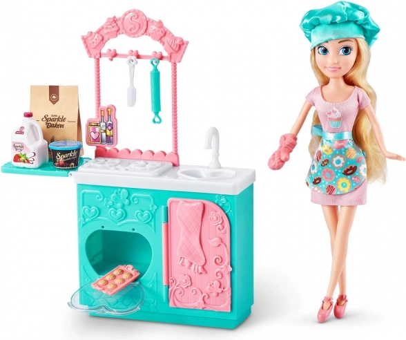 Komplektā ir visi nepieciešamie elementi spēlei, tostarp mazas rotaļu pārtikas sastāvdaļas, bļodas, lāpstiņas un formiņas, kas ļauj reālistiski atdarināt cepšanu. Atver krāsni, ieliec tajā cepumiņus un izliecies, ka tie cepas! Pateicoties maināmajām drēbēm, lelli var kombinēt ar citām Sparkle Girlz sērijas varonēm.