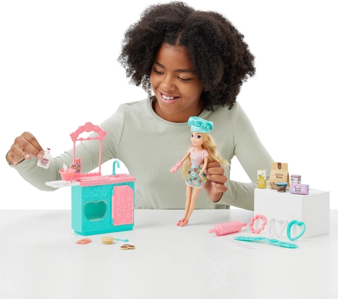 Komplektā ir viss nepieciešamais pilnvērtīgai cepšanas lomspēlei, tostarp lelle, rotaļu pārtika un virtuves piederumi.