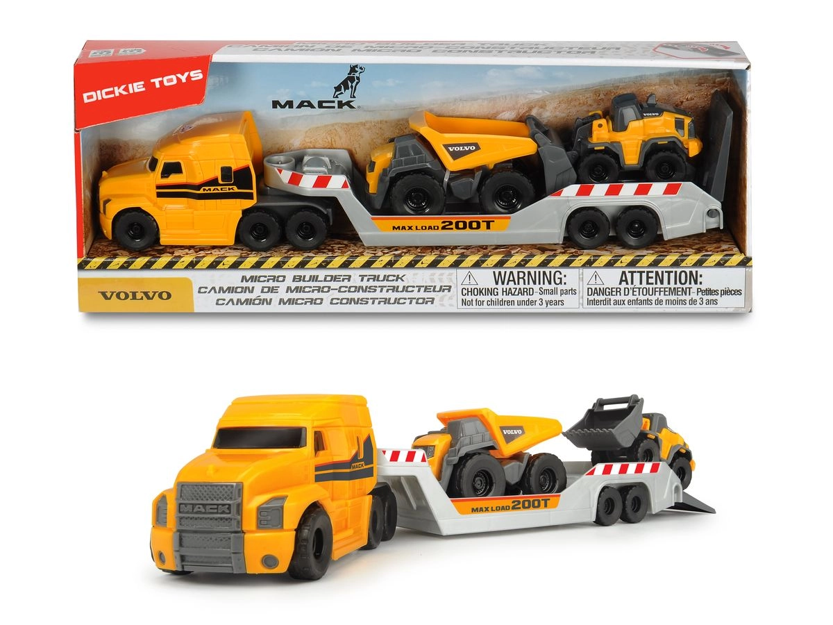 Ar šo kvalitatīvo Micro Builder komplektu bērni viegli izveidos savu būvlaukumu. MACK kravas auto nodrošina plašu kravas vietu VOLVO pašizgāzēja un frontālā iekrāvēja pārvadāšanai, savukārt pārvietojamā rampa atvieglo iekraušanu un izkraušanu. Intuitīvais risinājums ļauj piekabi bez piepūles pievienot un atvienot arī bērnu rokām.