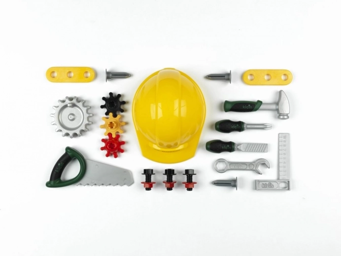 - Komplekta saturs (20 detaļas): darbagalds, dzeltena ķivere ar regulējamu aizdari, zāģis, āmurs, skrūvgriezis, atslēga, vīle, bīdāmais mērinstruments, 12 būvelementi (skrūves, naglas, zobratu riteņi u.c.).