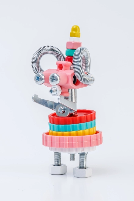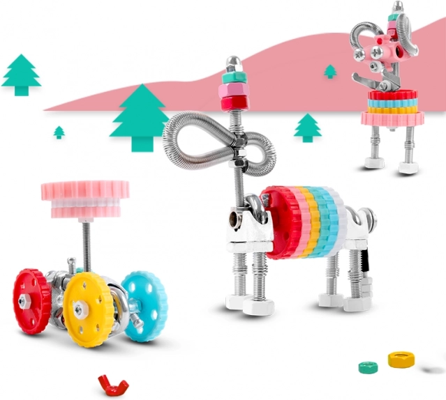 - Konstruktors 3 vienā, krāsainas uzgriežņu mātes, skrūves, veidoti biti, instrumenti salikšanai