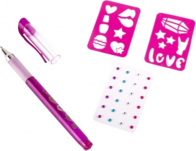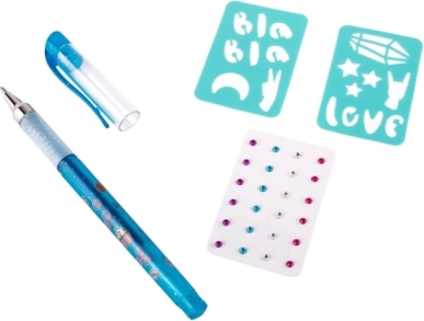 - 1 smaržīga gēla pildspalva 3 krāsās, 2 šabloni, pašlīmējoši mirdzoši akmentiņi