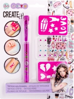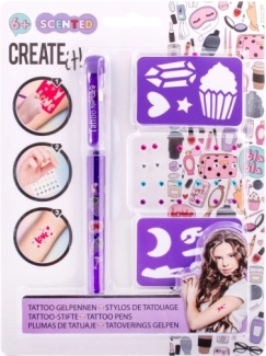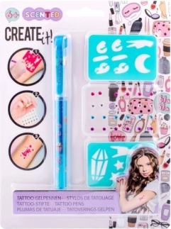 Tetovēšanas komplekts CREATE IT! pārvērš katru pēcpusdienu radošā darbnīcā. Veidojiet oriģinālus pagaidu tetovējumus ar smaržīgu gēla pildspalvu un šablonu palīdzību, kas nodrošina tīras un skaistas formas. Mirdzošie akmentiņi piešķir motīviem iespaidīgu spīdumu.