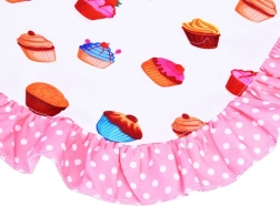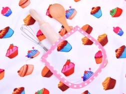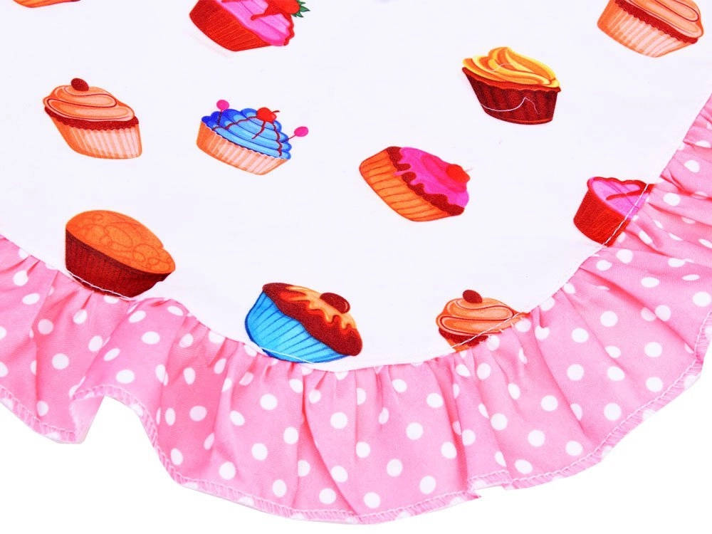 Priekšauts un aksesuāri ar krāsainu kēksiņu rakstu un rozā volāniem pasargā apģērbu un piešķir gatavošanai rotaļīgu stilu.