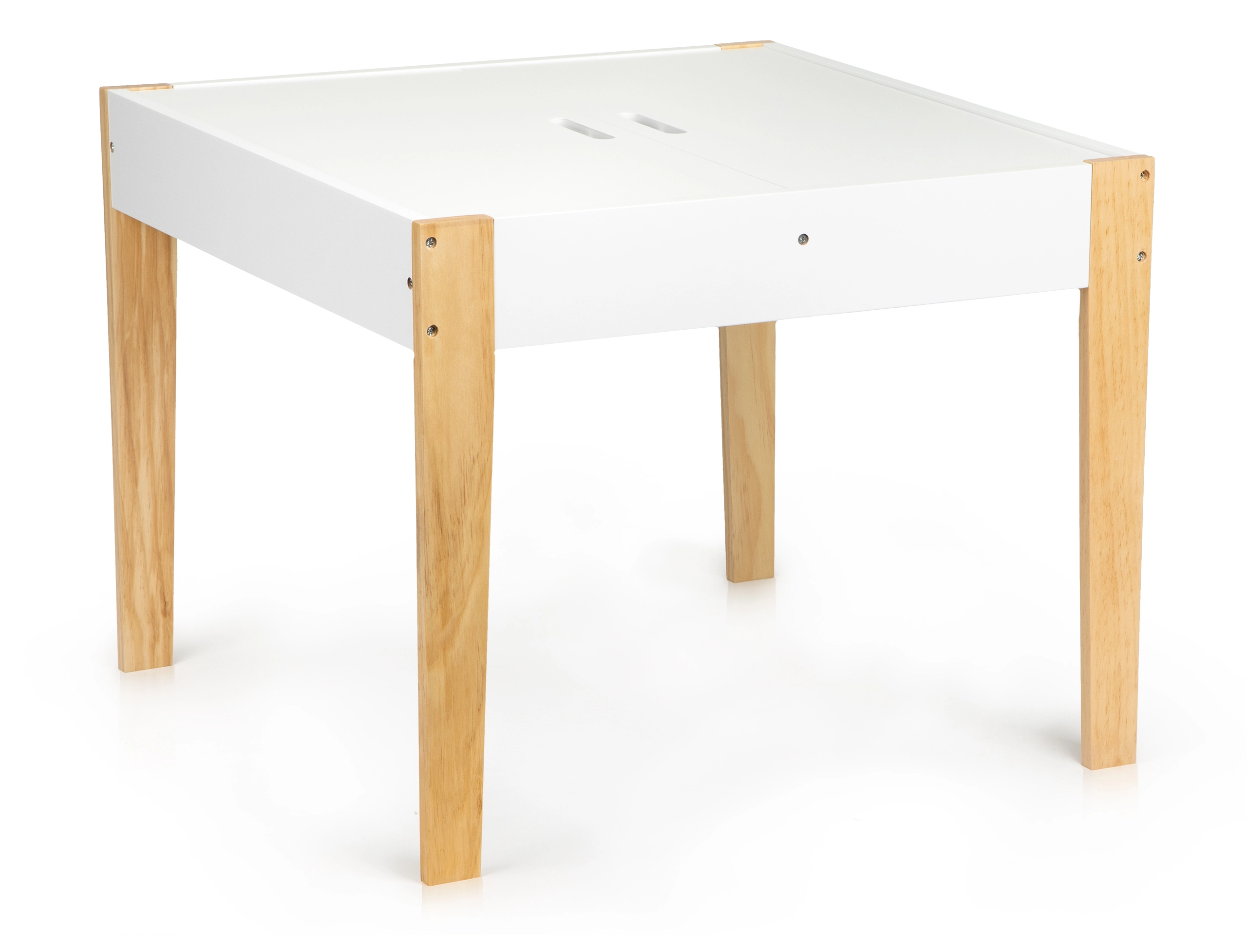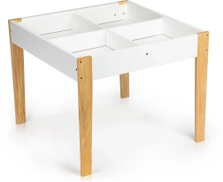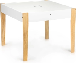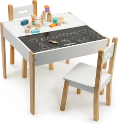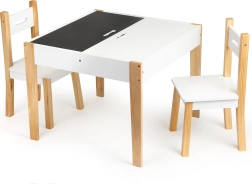 Pēc spēlēm visas rotaļlietas var viegli sakārtot zem noņemamās galda virsmas. Komplektā ir divi ērti krēsli ar priedes koka kājām.