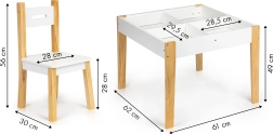 Lielisks komplekts jūsu bērnam, kas, pateicoties vienkāršajai formai, lieliski iederas jebkurā bērnu istabā. Galda priedes koka kājas nodrošina stabilitāti, bet MDF virsma ir viegli kopjama un izturīga pret bojājumiem.