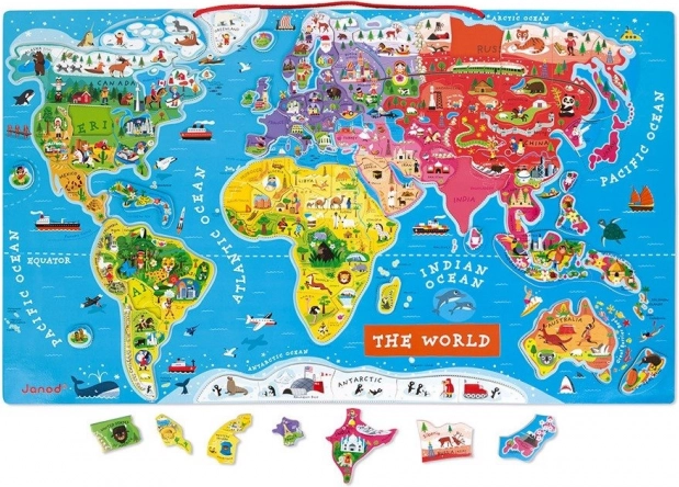 Šī skaistā magnētiskā pasaules karte ir 77 x 46 x 1 cm liela un ietver 92 koka puzles gabaliņus. Katrs gabaliņš attēlo reģionu vai valsti, uz tā ir norādīta galvaspilsēta un attēls, kas raksturo konkrēto vietu, piemēram, nozīmīgas celtnes, pieminekļi, dzīvnieki un augi. Karte ir angļu valodā un to var piekārt pie sienas, padarot to par unikālu bērnistabas interjera akcentu.
