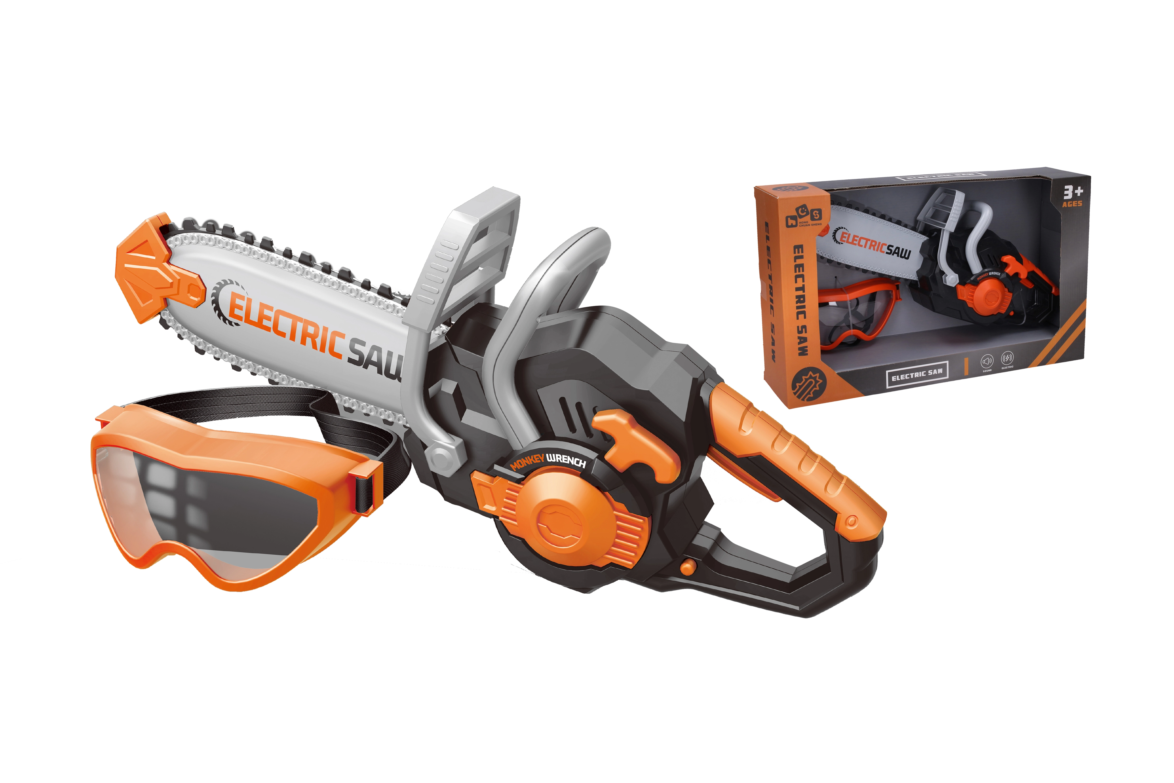 Aizsargbrilles nodrošina drošību spēles laikā. Poga kreisajā pusē ļauj viegli aktivizēt zāģi, kas pastiprina reālistisku spēles pieredzi.
