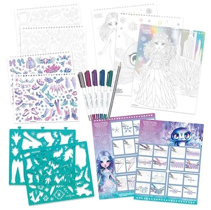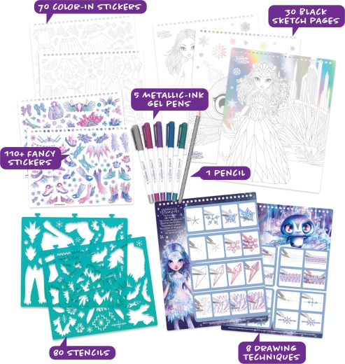 Iepakojumā iekļauti bagātīgi piederumi: metāliskās želejpildspalvas efektīgiem akcentiem, plastmasas šabloni precīzām aprisēm, uzlīmes, tostarp tās, kuras paredzēts izkrāsot, un zīmulis skicēšanai. Tematiskās lapas ar tēlu Iceana aicina krāsot, dekorēt un veidot pašiem savas ilustrācijas.