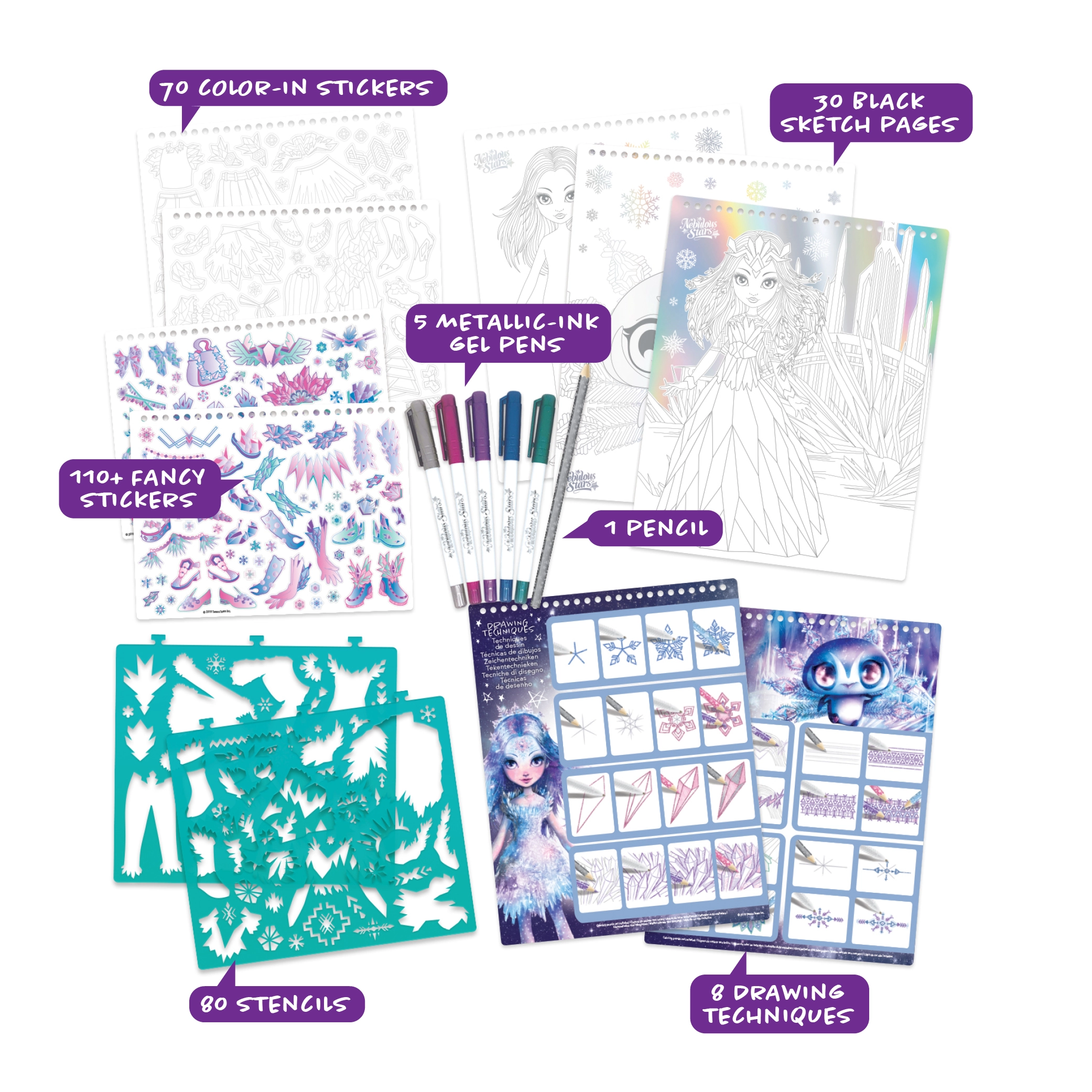 Iepakojumā atradīsiet visu, kas bērniem nepieciešams: 80 šablonus, 5 metāliskas želejpildspalvas, zīmuli, 30 lapas un kaudzi uzlīmju. Nekas nav jāiegādājas papildus.