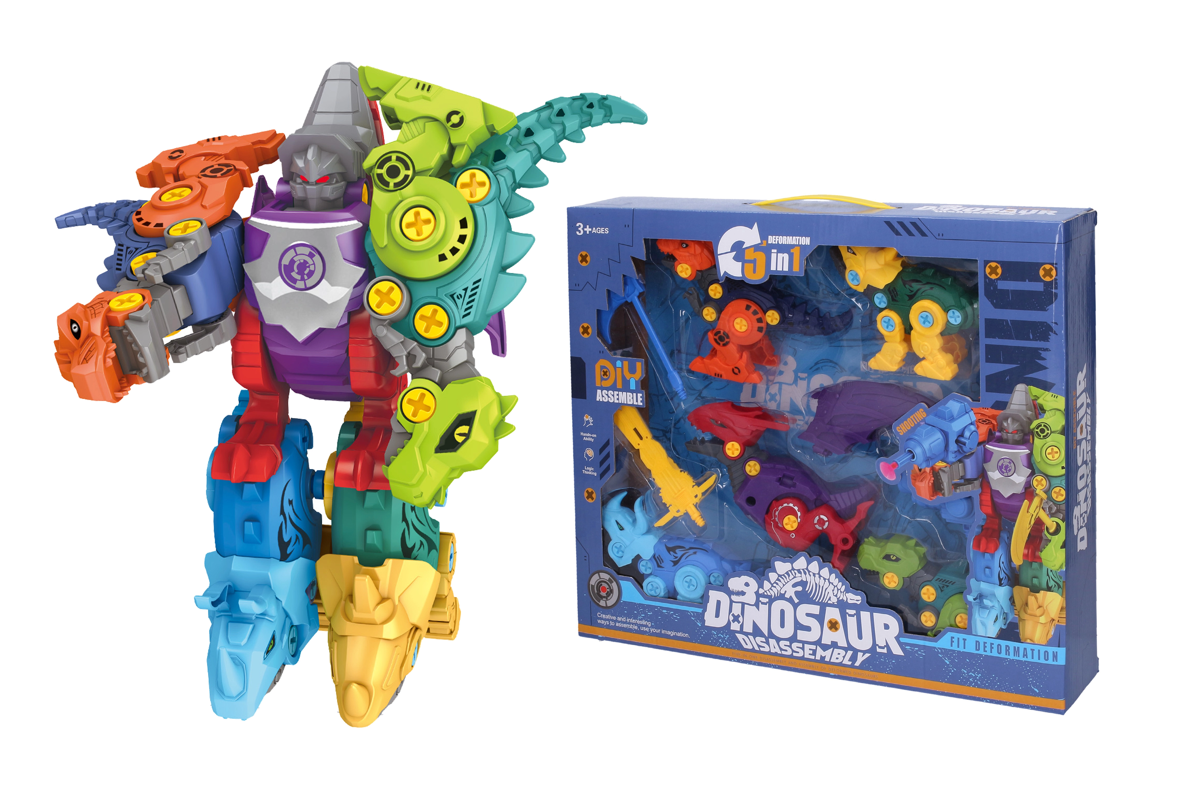 Skrūvējamais dinozauru komplekts 5-in-1 sniedz bērniem stundām ilgu radošu izklaidi. Katru no pieciem dinozauriem var atsevišķi salikt, izmantojot vienkāršas skrūvējamas detaļas, un pēc tam tās visas apvienot vienā transformējamā robotā ar izšaujamu ieroci. Rotaļlieta veicina pacietību, koncentrēšanos un tehniskās domāšanas attīstību.