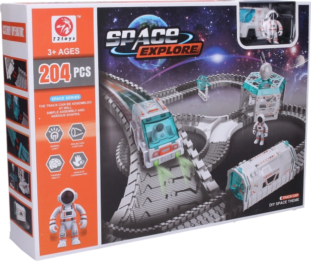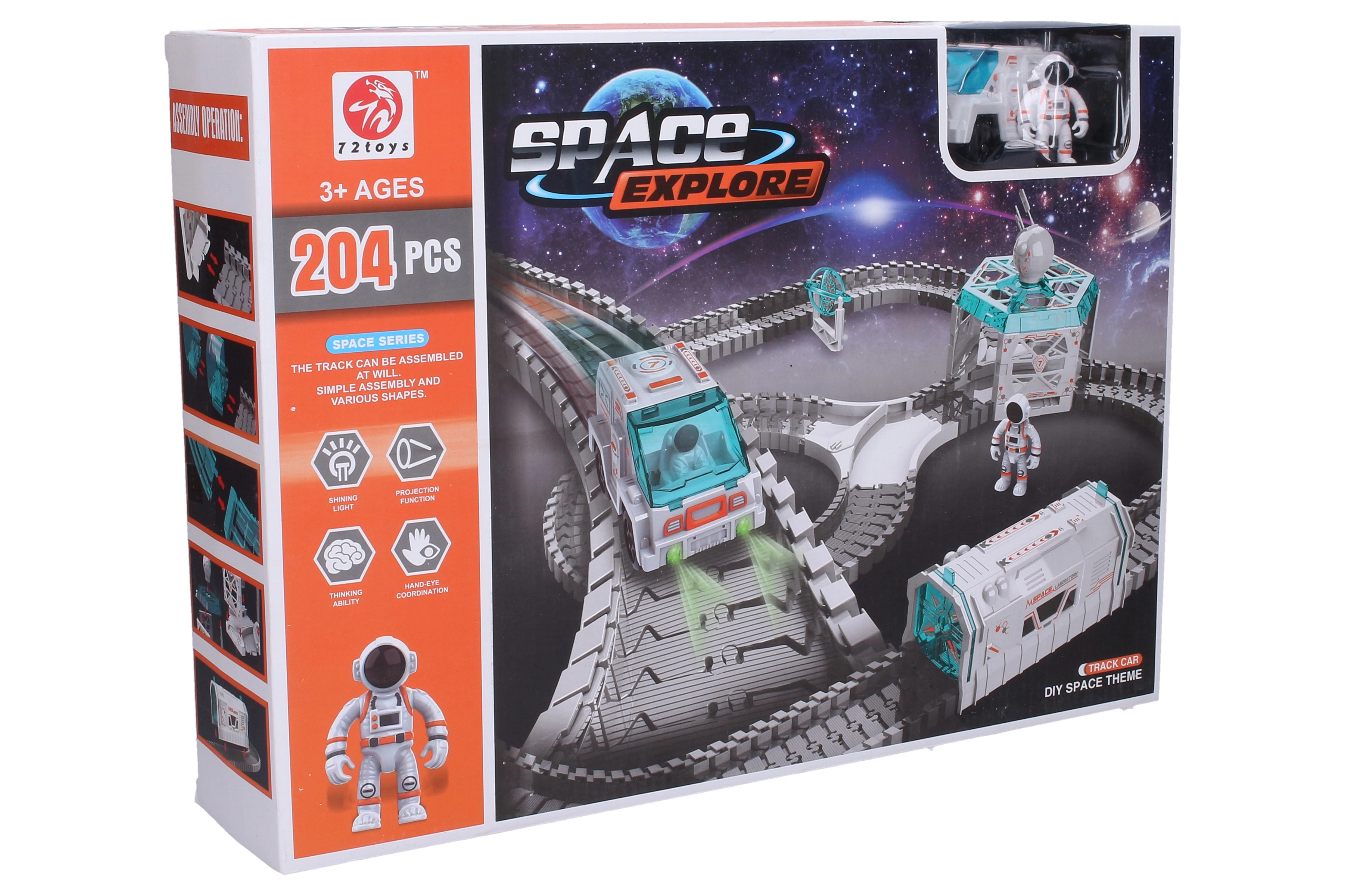 Atklājiet kosmosa piedzīvojumus ar šo kosmisko sacīkšu trasi ar izmēriem 85 × 75 × 32 cm. Komplektā ir mašīna, kosmonauta figūra un darbojošs projektors ar gaismas efektiem. Trasi var brīvi salikt dažādās formās, tāpēc izklaide nekad nebeidzas.