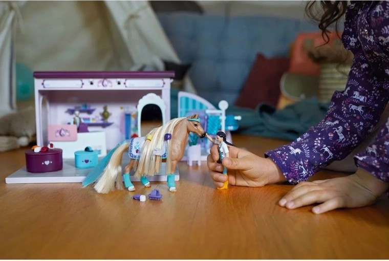 Saliekams zirgu salons no Schleich HORSE CLUB Sofia's Beauties kolekcijas piedāvā visu nepieciešamo jūsu zirga nevainojamam stilam. Tas ļauj viegli mainīt krēpes un asti, lai iegūtu labākās fotosesijas.