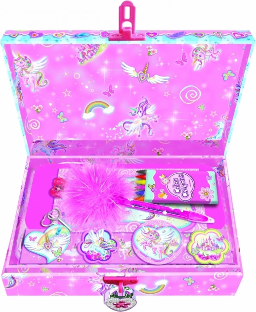 Šis burvīgais komplekts apvieno jautrību un kārtību: bērni var glabāt savus noslēpumus slēdzamā rotu lādītē un rakstīt vēstules vai ziņas vēstuļu komplektā. Smalkais vienradžu motīvs iepriecinās visus burvju stāstu un pasteļtoņu cienītājus.