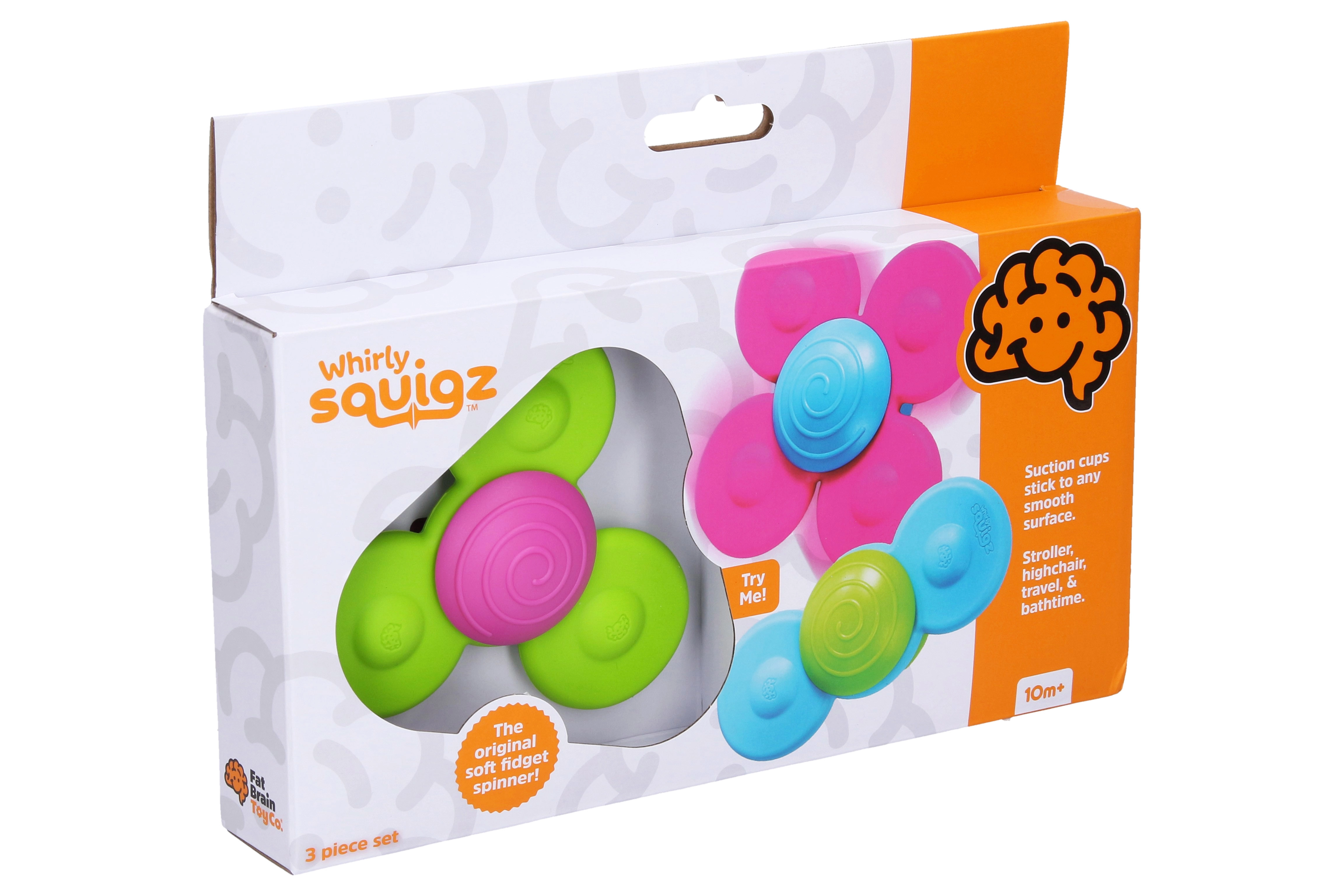 WHIRLY SQUIGZ komplektā ir trīs dažādas formas spineri ar piesūcekņiem, kas stingri piestiprinās pie jebkuras gludas virsmas – no logiem un flīzēm līdz pat vannas malai. Pietiek viegli uzsist, un spineri sāks griezties, sniedzot bērniem vizuālu un taustes stimulāciju un nomierinošu sensoru pieredzi.