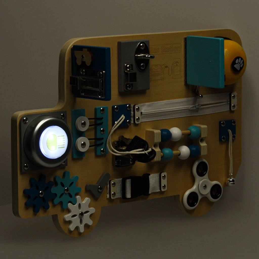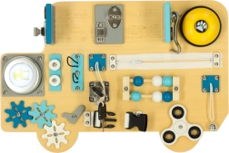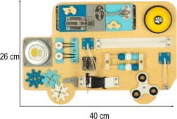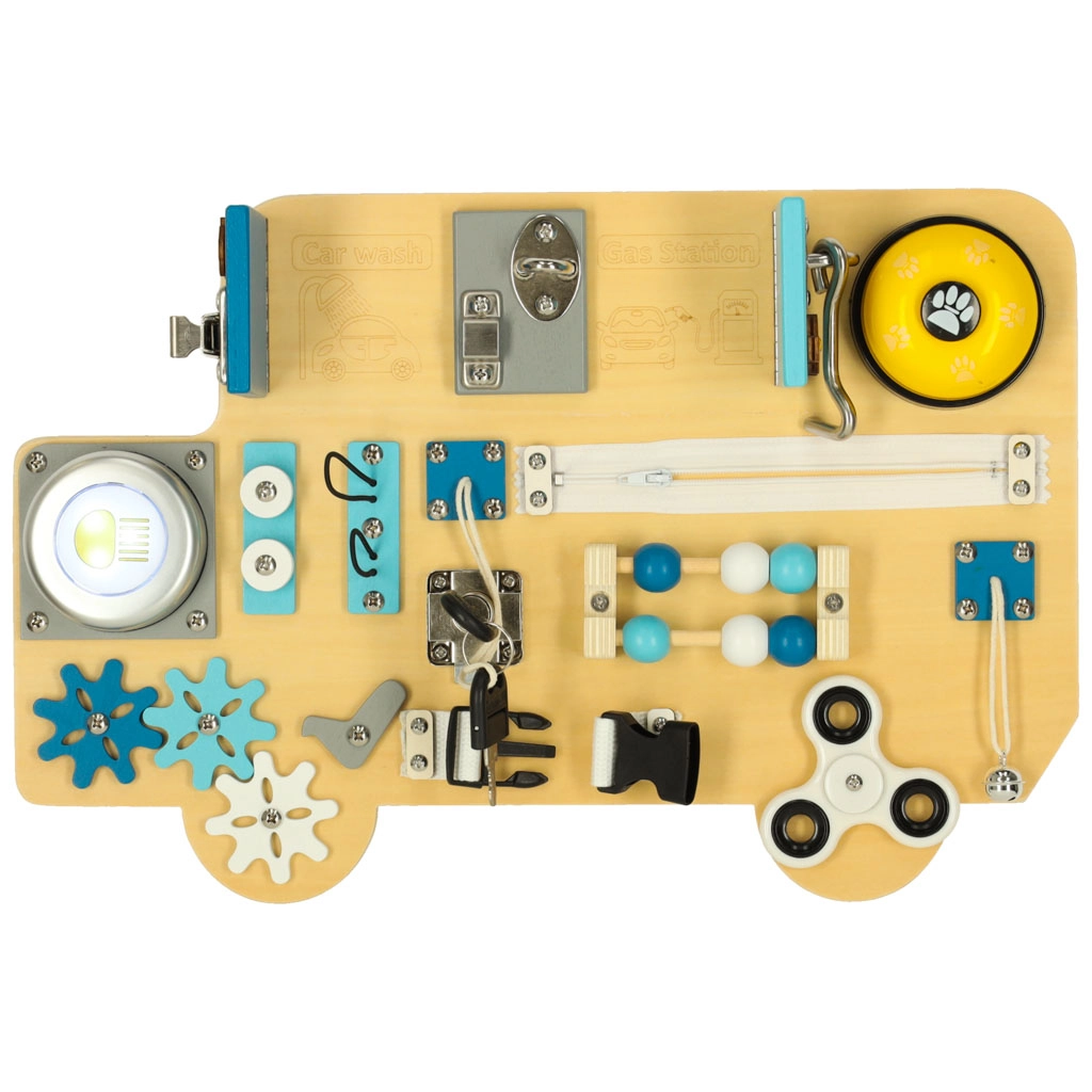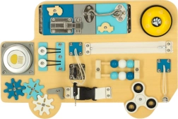 Sensorā tāfele autobusa formā iepriecinās visus mazos transportlīdzekļu fanus. Koka detaļas ar auto tematiku, slēptie attēli ar automazgātavu un degvielas uzpildes staciju, kā arī kustīgie elementi veicina ziņkāri un māca bērniem cēloņu un seku sakarības.