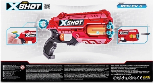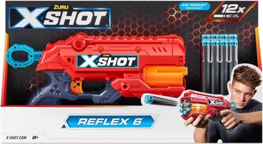 Sāc aizraujošu darbību ar pistoli X-SHOT Reflex 6 oranžā krāsā. Pateicoties rotējošam cilindriskajam magazīnam, tā izšauj līdz 6 bultām ātrā secībā un sasniedz iespaidīgu lidojuma distanci līdz 27 m. Komplektā ir 12 putu bultas, tāpēc izklaide var sākties uzreiz.