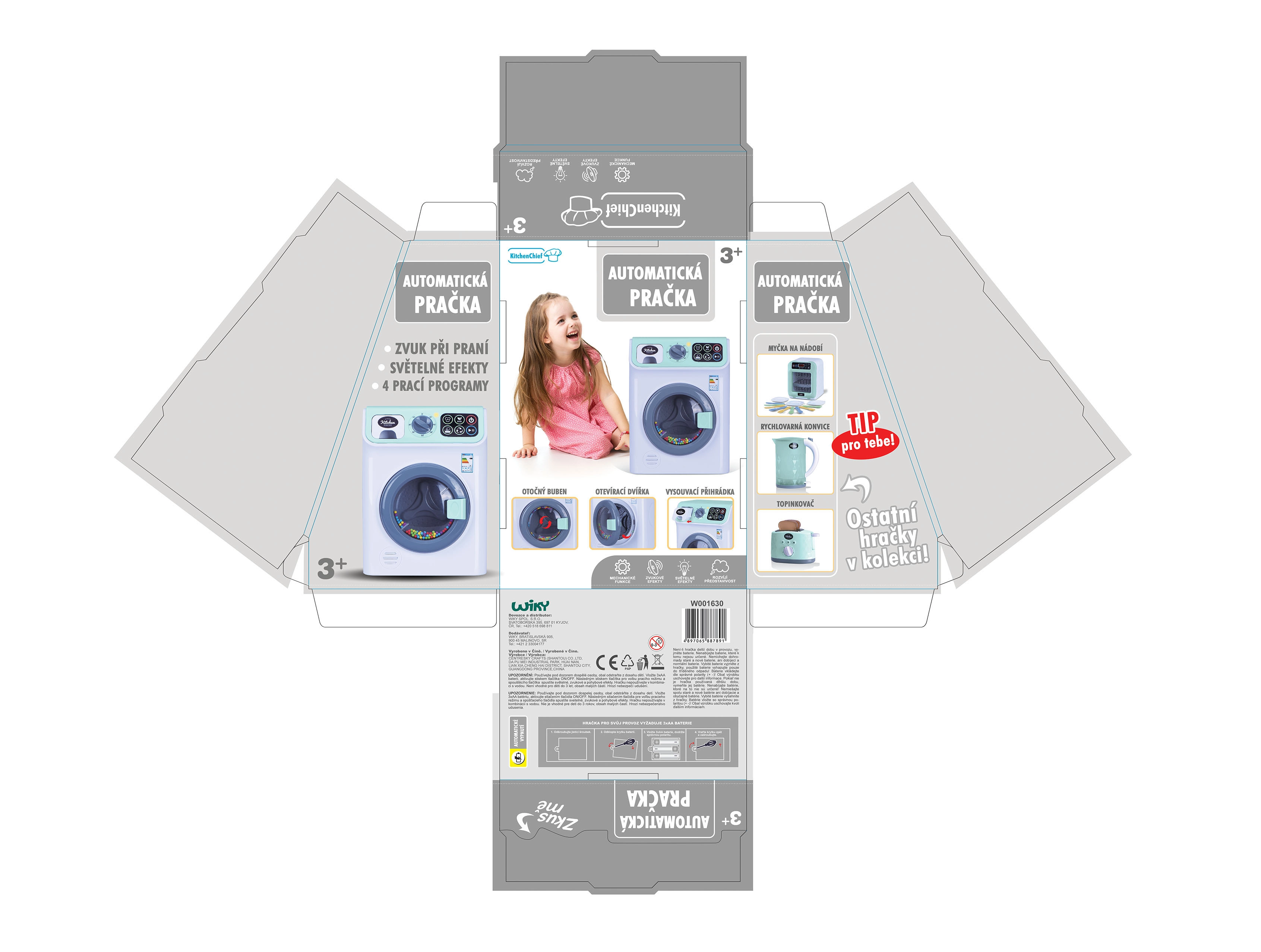 Šī bērnu veļasmašīna sniedz autentisku mazgāšanas pieredzi – pietiek piepildīt bungu, izvēlēties programmu un temperatūru, pievienot veļas pulveri un ieslēgt. Bunga patiešām griežas, un visu pavada reālistiski gaismas un skaņas efekti, padarot spēli vēl aizraujošāku.