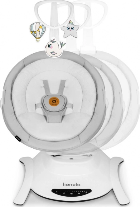 Lionelo Bella Set apvieno šūpulīša un šūpoļu funkcijas ar maināmām sēdekļa daļām, kas ļauj izmantot vai nu tradicionālās šūpoles, vai plakanu šūpulīti.