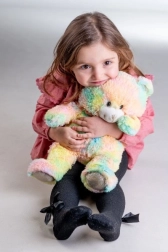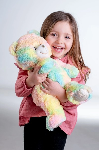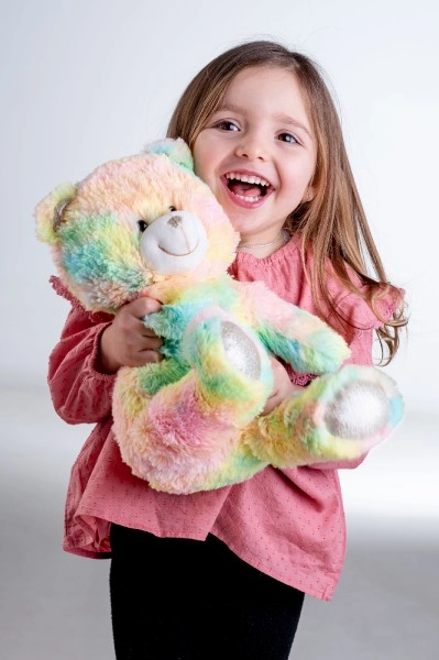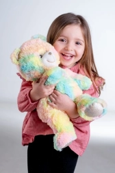 Mīkstā rotaļlieta ar varavīksnes krāsas kažociņu piesaista uzmanību un pārsteidz ne tikai ar izskatu, bet arī ar patīkamu maigumu pieskārienā.