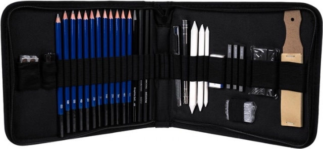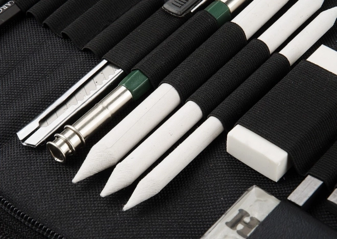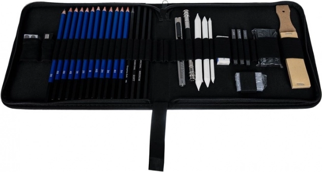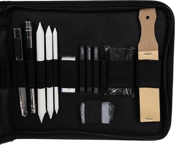 Komplektā ietilpst arī blenderi (papīra tortiljoni) trīs diametros, grāmatsaišu nazis, dubultais un klasiskais asināmais, mīcāmā (formējamā) dzēšgumija un klasiskā dzēšgumija, kā arī slīppapīru komplekts ideālai gala veidošanai. Komplekts lieliski der portretiem, tehniskajai zīmēšanai un mākslinieciskām skicēm.