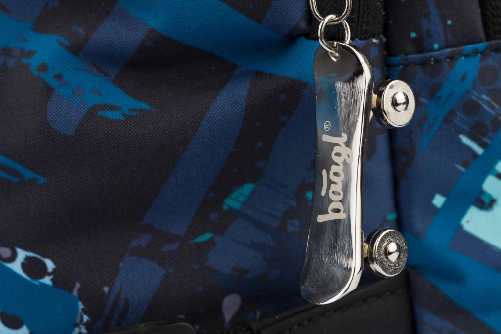 Komplektā ietilpst ietilpīgs penālis etui ar izvelkamu pārsegu, kabatu ar rāvējslēdzi un stundu sarakstu (bez pildījuma). Viegls apavu maisiņš ar savelkamu auklu nēsājams uz muguras, turklāt tam ir spīdošs BAAGL logotips papildu efektam un drošībai. Materiāli ir izturīgi un ūdensizturīgi, SKATE sērijas mugursomas ir testētas un sertificētas akreditētā laboratorijā.
