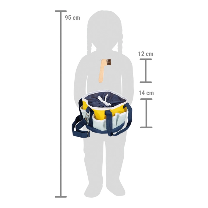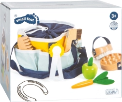 Šis kvalitatīvais komplekts iedomu spēlei ļauj bērniem parūpēties par savu iemīļoto zirgu kā īstiem kopējiem. Soma ar platu savelkamu atvērumu saturēs visus piederumus kārtībā, sānu kabatas nodrošinās pārskatāmību un ātru piekļuvi. Iepakojumā atradīsiet koka rīkus birstēšanai, ķemmēšanai un nagu tīrīšanai, kā arī turnīra lenti svinīgai noskaņai.