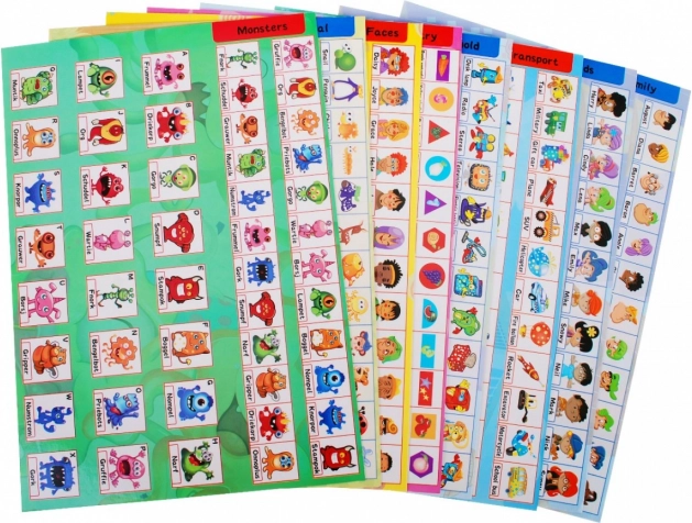 Ilustrētas kartītes ar kategorijām (sejas, formas, transports, ģimene, mošķi) veicina vārdu krājuma, uzmanības un asociatīvās domāšanas attīstību.