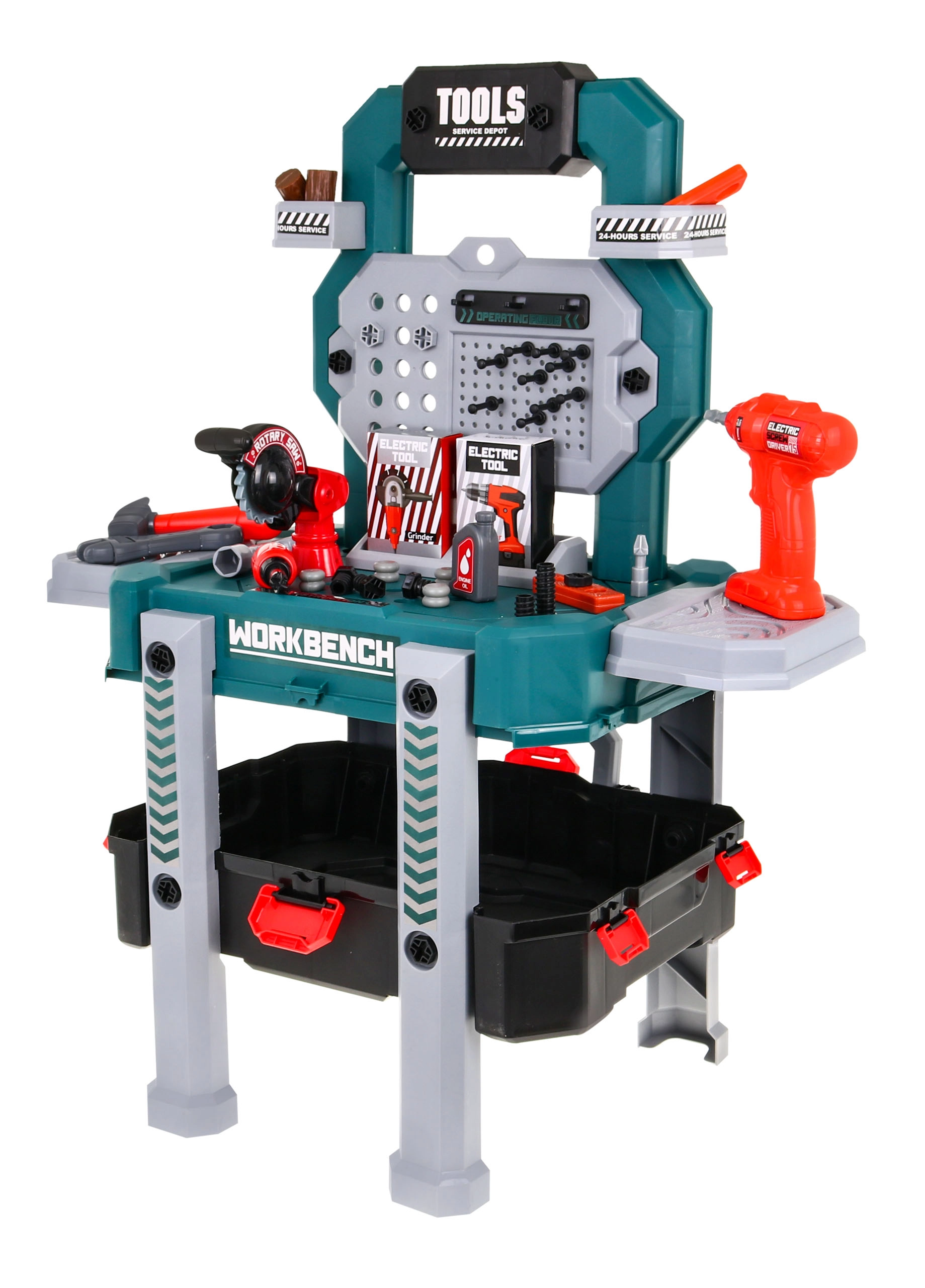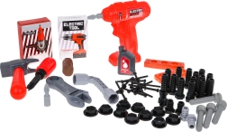Zāģis, āmuriņš, skrūvgriezis, atslēgas, skrūves, “koka” dēlīši un citi piederumi reālistiskai meistaru spēlei.