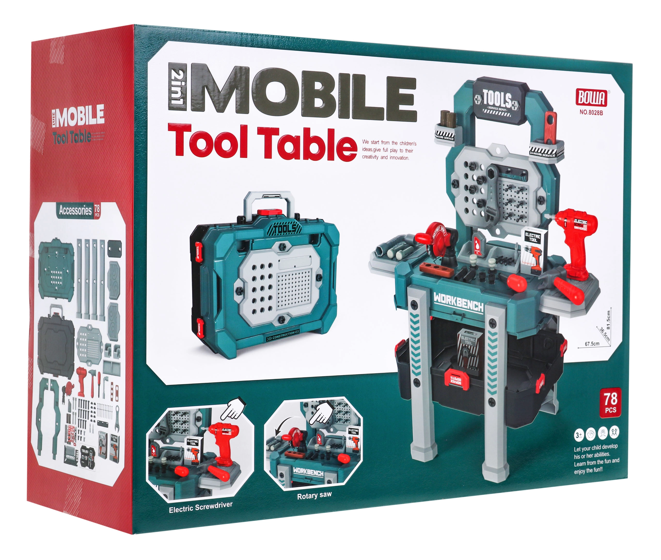 Komplektā ir 78 detaļas, tostarp zāģis, āmuriņš, skrūvgriezis, atslēgas, skrūves un koka “dēlīši”. Pēc spēles visu var viegli ievietot lielajā koferī ar rokturi. Lieliski attīsta smalko motoriku, radošumu un lomu spēles.