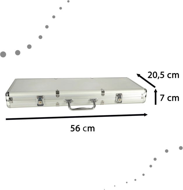 Komplektā ir arī kauliņi, kas paver iespējas dažāda veida spēlēm, un atslēdziņas drošai transportkofča aizslēgšanai. Elegants un izturīgs dizains padara šo koferīti piemērotu drošai pārvadāšanai un spēļu piederumu uzglabāšanai.