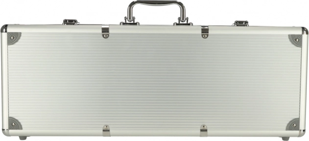 Komplektā ietilpst žetoni, kārtis un kauliņi dažādiem spēļu variantiem. Sudraba koferītis nodrošina drošu piederumu uzglabāšanu un ērtu pārnēsāšanu.