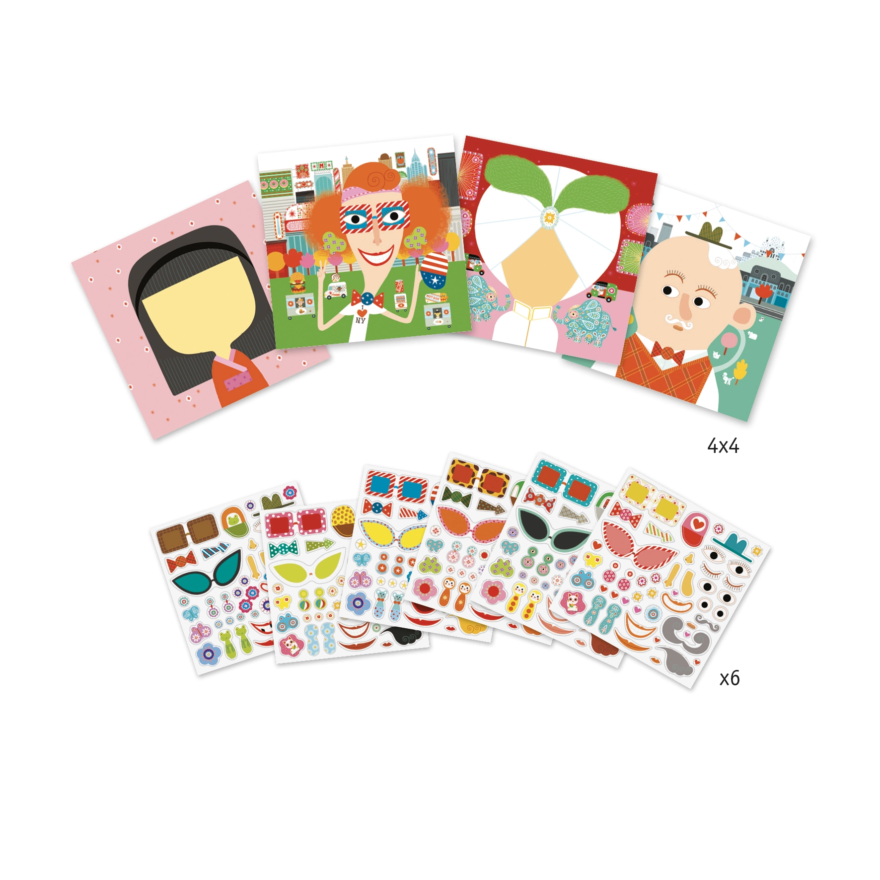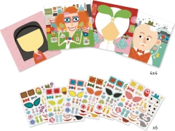 Jautrs radošais komplekts mazajiem māksliniekiem sniedz gan izklaidi, gan fantāzijas attīstību. Bērni no 16 veidnēm var izveidot savas sejas, izmantojot 240 noņemamas uzlīmes – acis, degunus, mutes, brilles, ūsas un auskarus. Atkārtoti izmantojama izklaide attīsta sīko motoriku, radošumu un stāstīšanas prasmes. Piemērots bērniem no 3 gadu vecuma.
