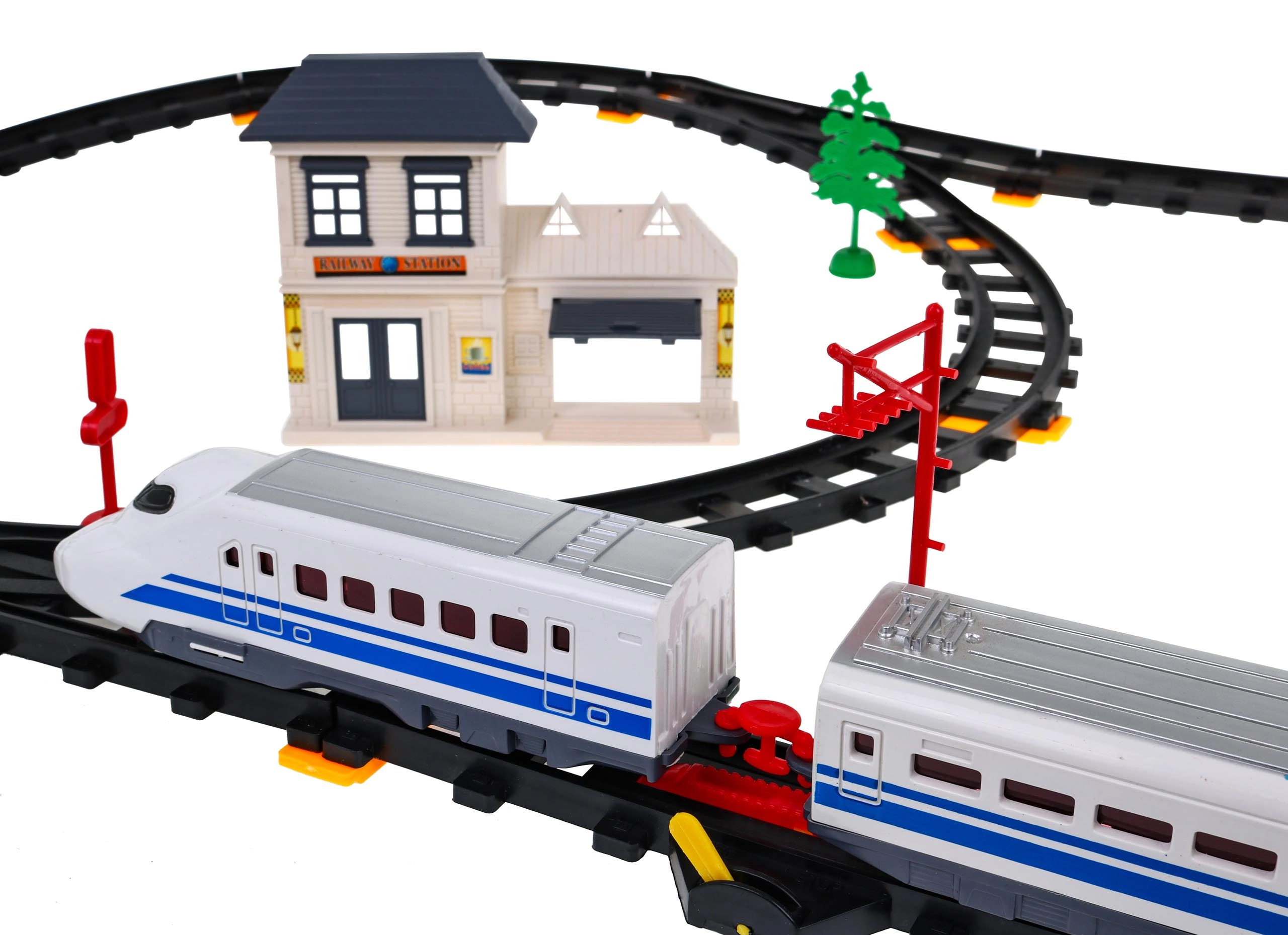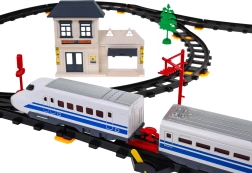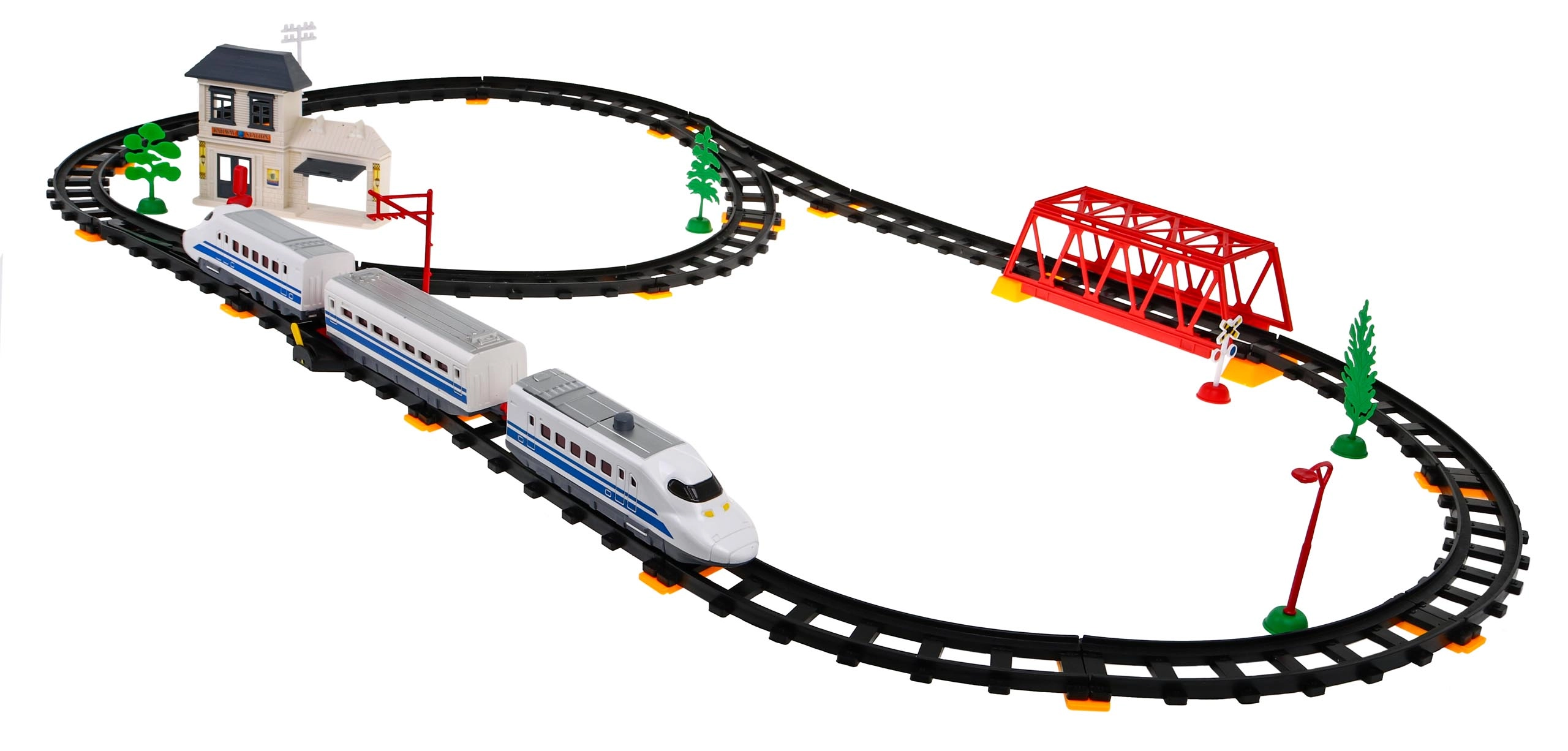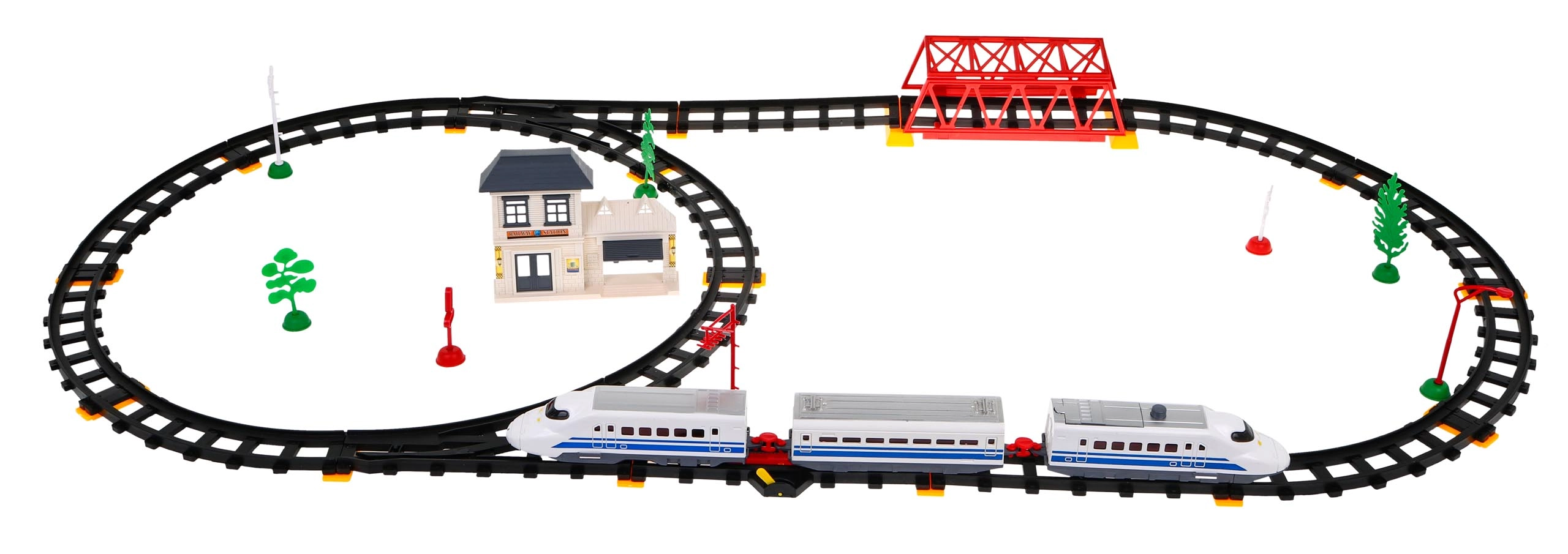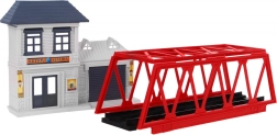 Komplektā ietilpst lokomotīves, vagoni, dzelzceļa stacija, tilts un dekoratīvi elementi, piemēram, koki un ceļa zīmes. Šī rotaļlieta nodrošina interaktīvu un radošu pieredzi gan bērniem, gan vecākiem.