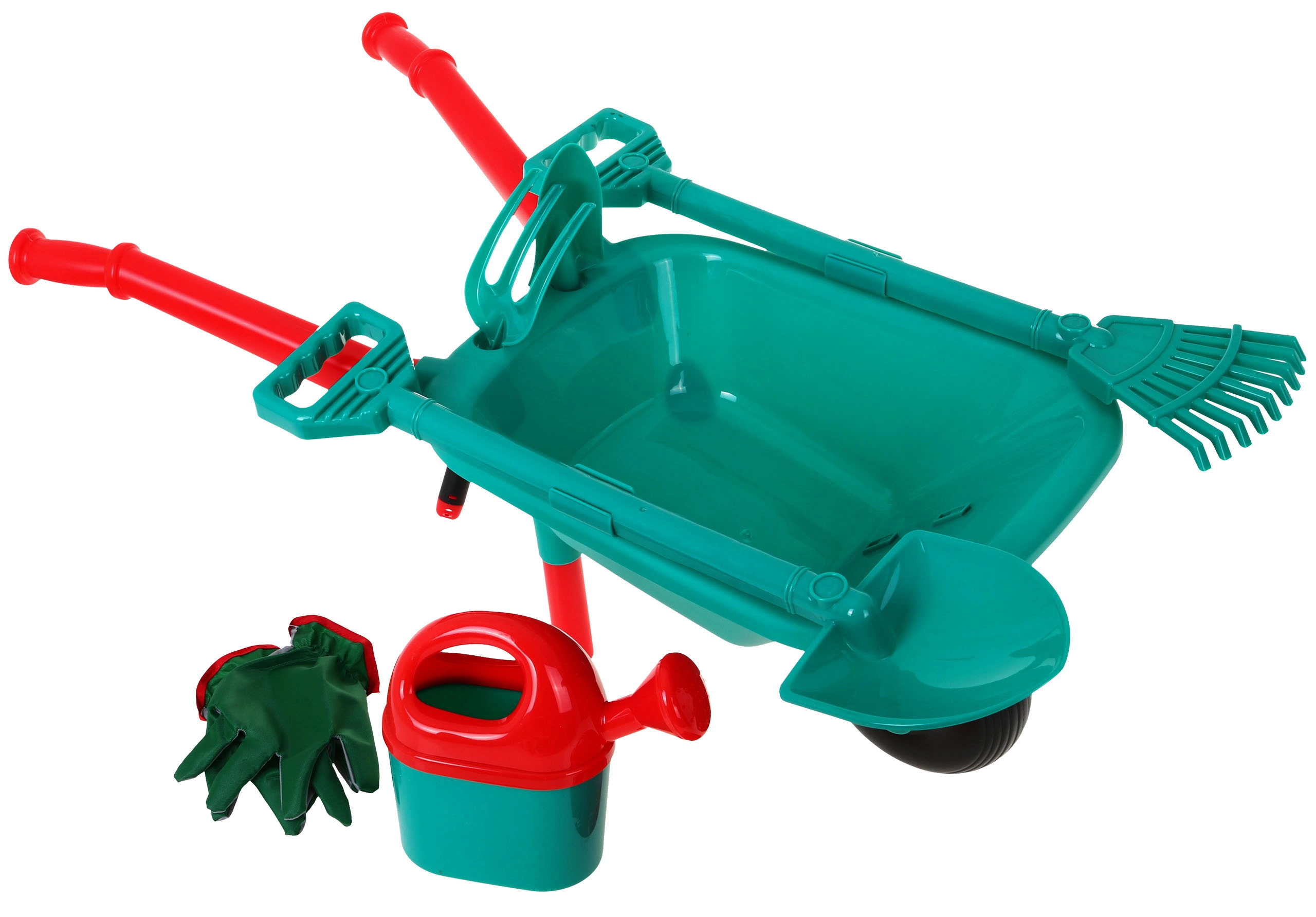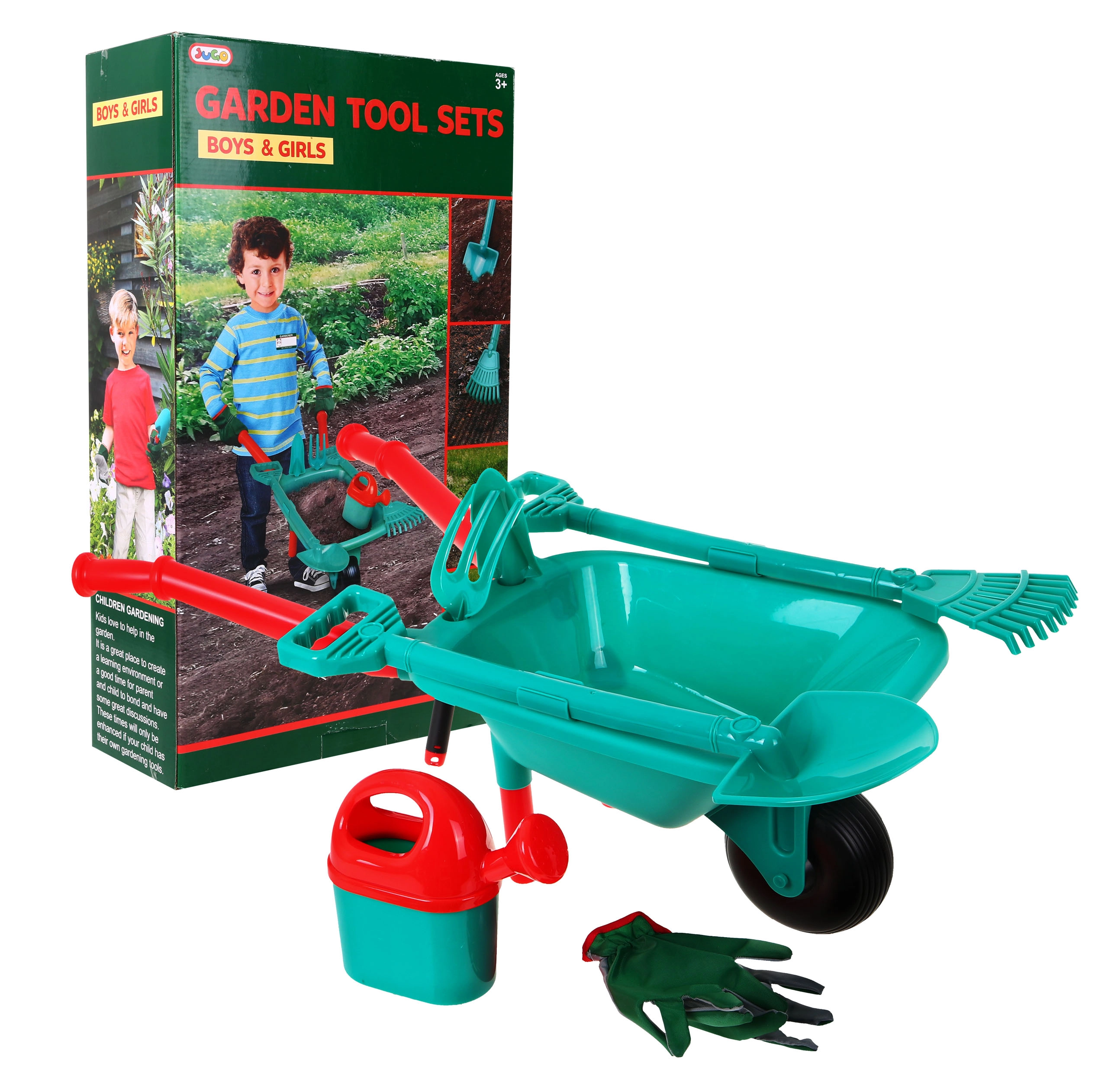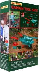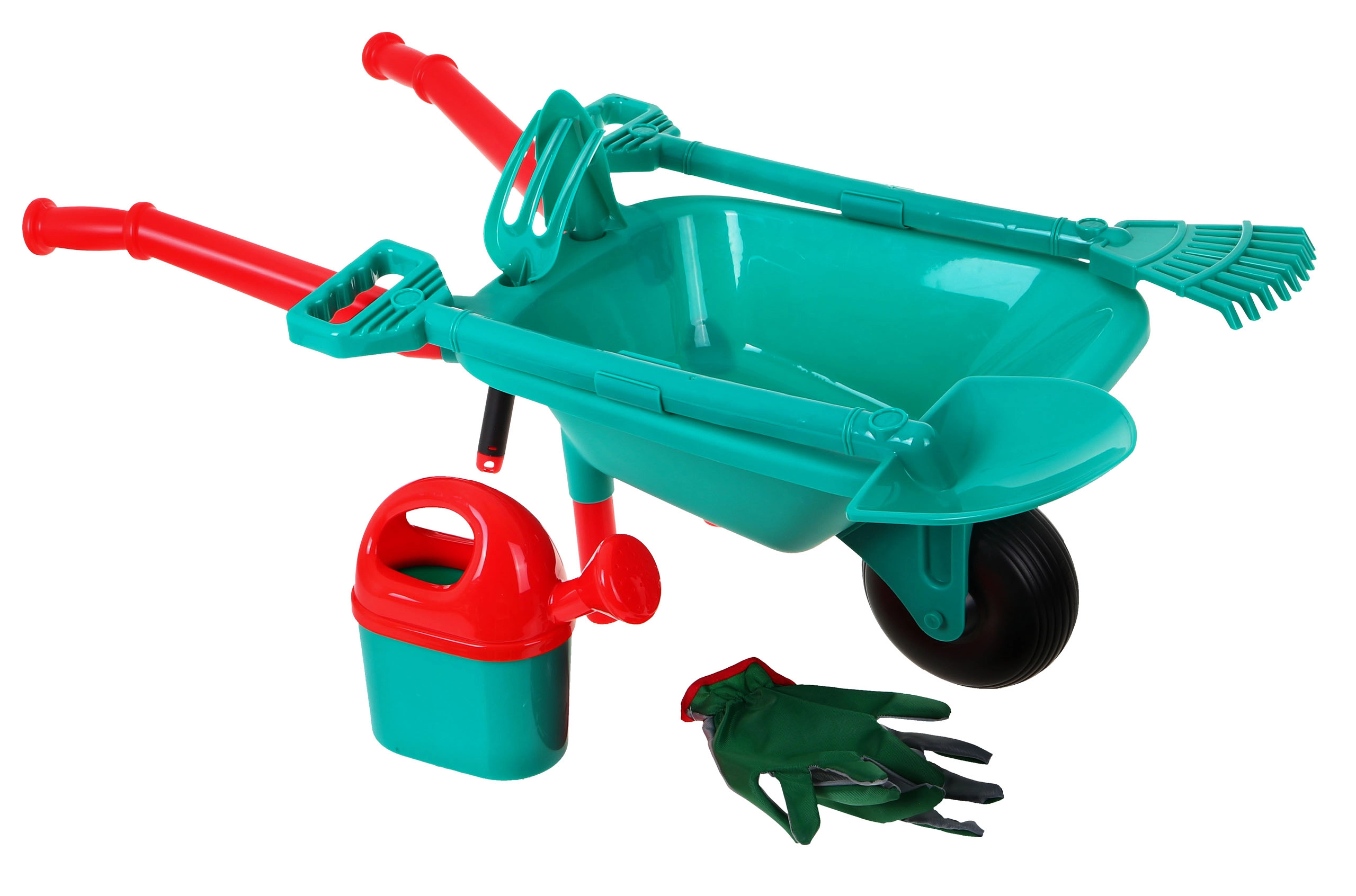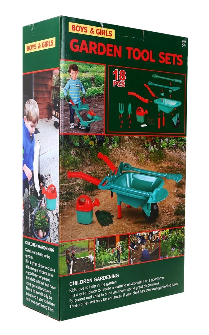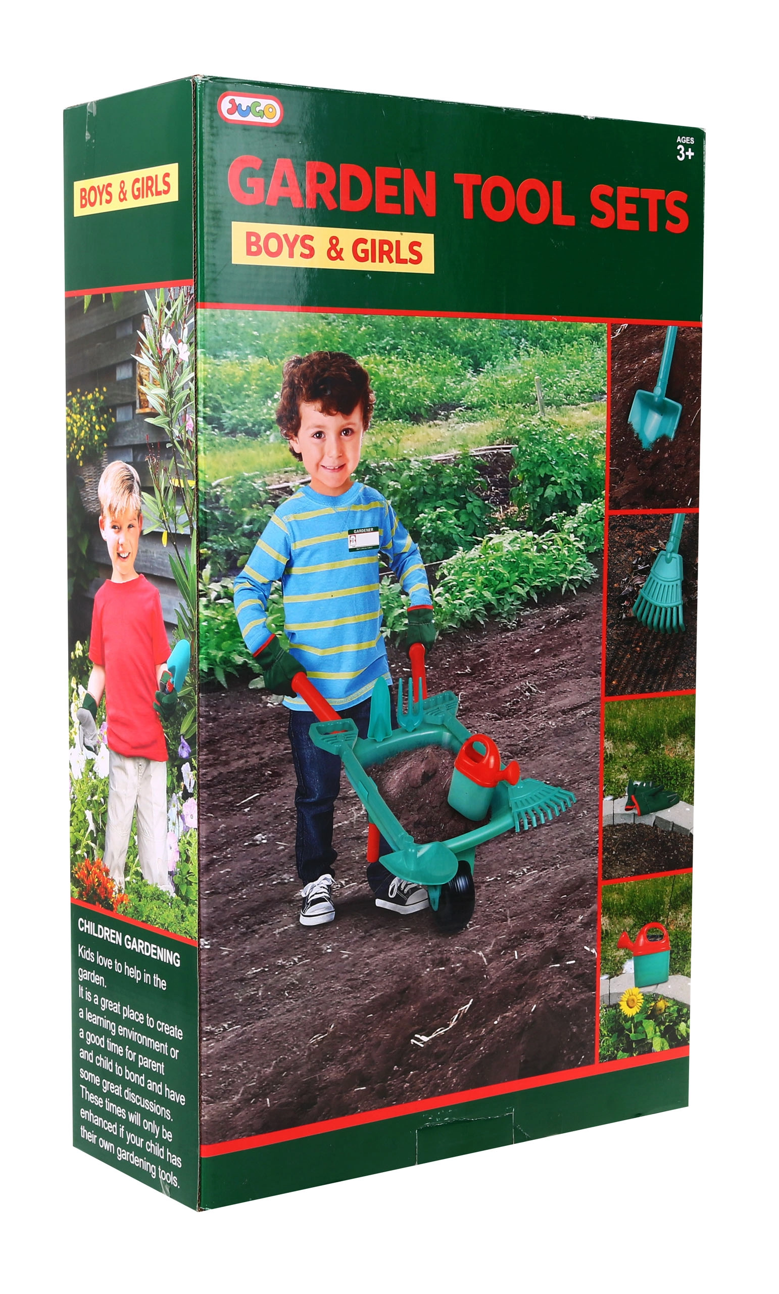 Šis visaptverošais dārza komplekts ļauj bērniem iesaistīties lapu grābšanā, pārstādīšanā un laistīšanā. Lielajiem ratiņiem ar stiprinājumiem ir praktiski caurumi un āķi darbarīku piestiprināšanai, lai bērni visu varētu ērti paņemt līdzi. Pateicoties vieglai plastmasas konstrukcijai, ar instrumentiem ir viegli darboties, un košās krāsas piesaista uzmanību.