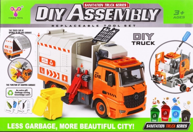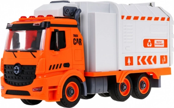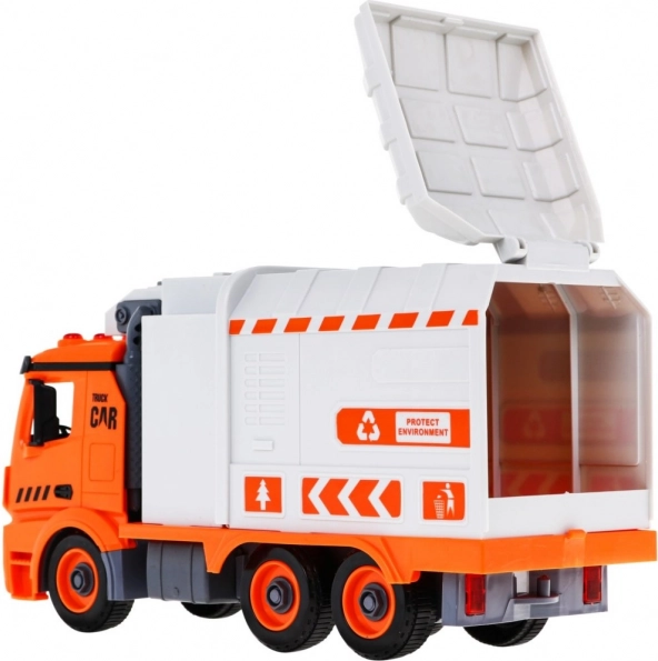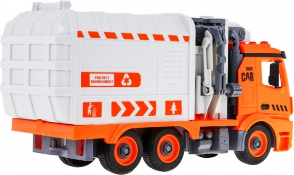 Ar skrūvgriezi ar maināmiem uzgaļiem bērns var mašīnu izjaukt un salikt. Sānu mehāniskā roka paceļ un iztukšo konteinerus kā īstā atkritumu savākšanas iekārtā.